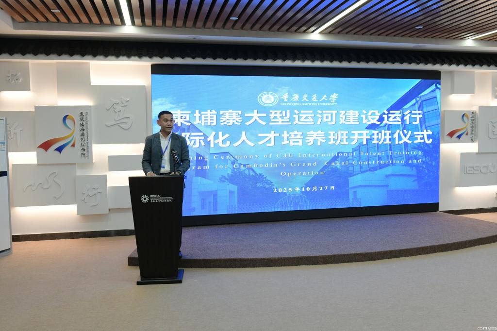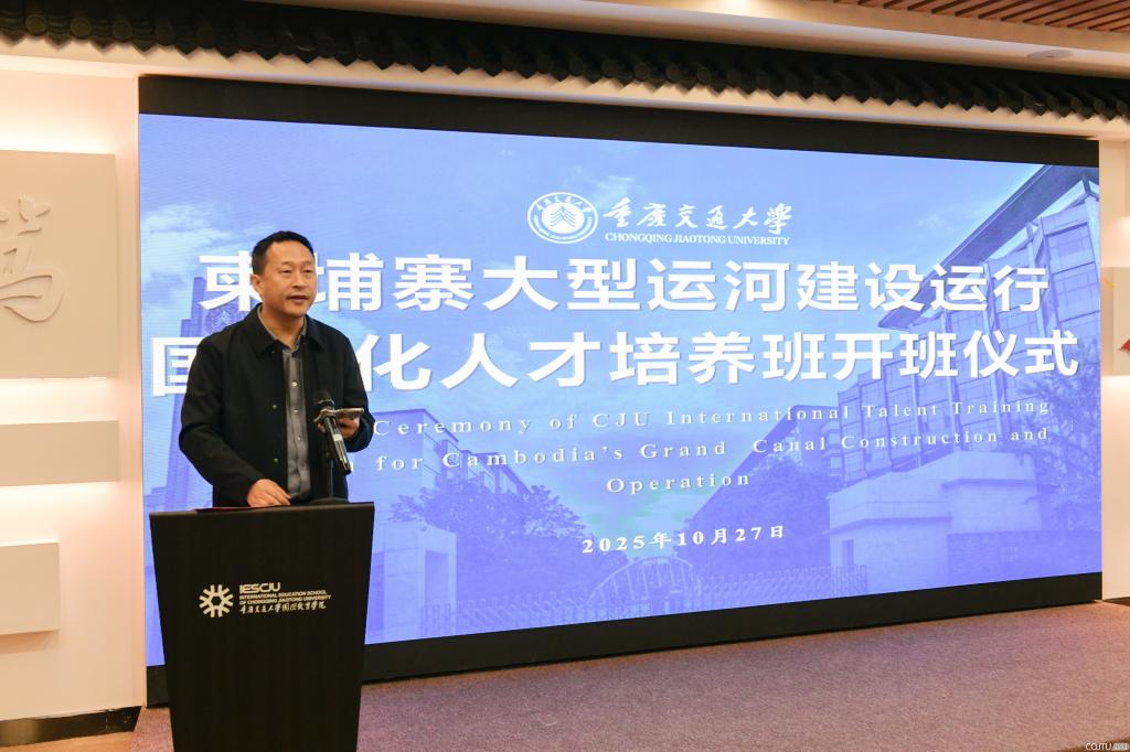 金秋十月,桂香满园。2025年10月27日上午,重庆交通大学国际教育学院、河海学院主办的“柬埔寨大型运河建设运行国际化人才培养班”开班仪式在国际教育学院 102 会议室隆重举行。重庆交通大学副校长郑丹,国际教育学院、国际合作交流处、河海学院、土木学院、航运学院等相关单位负责人、授课教师代表及柬埔寨公共工程与运输部30 名中高级管理人员出席仪式。仪式由国际教育学院院长余元玲主持。
