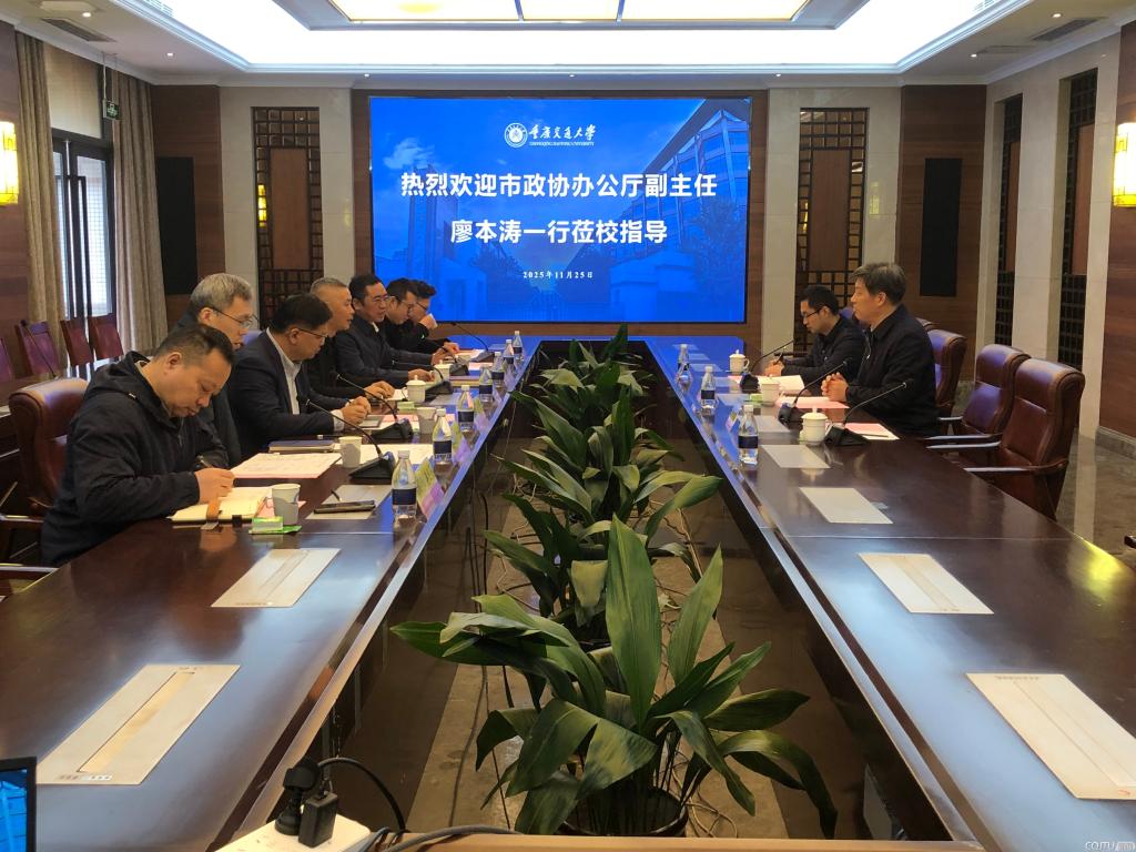 11月25日上午,市政协机关党组成员、办公厅副主任廖本涛一行来校调研乡村振兴帮扶工作。调研交流会在南岸校区国际会议室举行,校党委常委、副校长杨胜发,校党委常委、组织部部长、统战部部长任海涛出席会议,科技处处长徐向阳、产学研处处长吴磊、校工会主席刘一华、科技处副处长陈兆玮、后勤服务中心主任助理曾兵等相关单位负责人参加交流。会议由组织部部长任海涛主持。