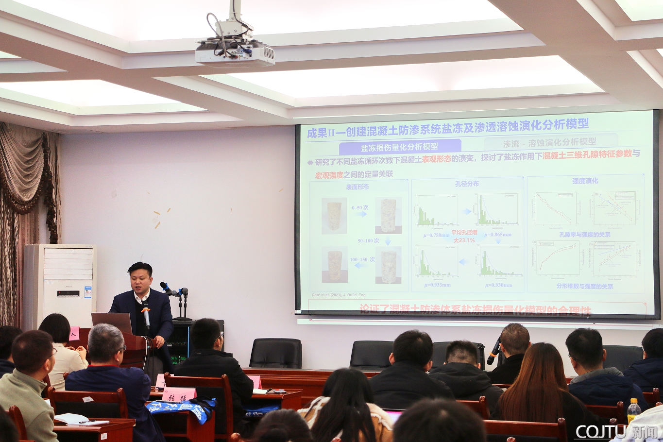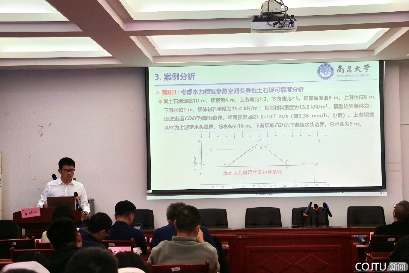 第一阶段学术报告由梁越教授主持,蒋水华教授作了题为“考虑多参数空间变异性的土石坝时变可靠度分析”的报告,详细介绍了一种非侵入式随机有限元方法,这种方法能够高效分析坝体与坝基材料参数时空变异性的影响,并降低土石坝时变可靠度分析的计算负担;甘磊教授以“深厚覆盖层高面板坝防渗系统长效性能评估方法”为题,详细介绍了水泥基防渗材料长效性能试验装置和测试技术、混凝土防渗系统盐冻及渗透溶蚀演化分析模型,并对深厚覆盖层高面板坝防渗系统长效性能进行了展望。