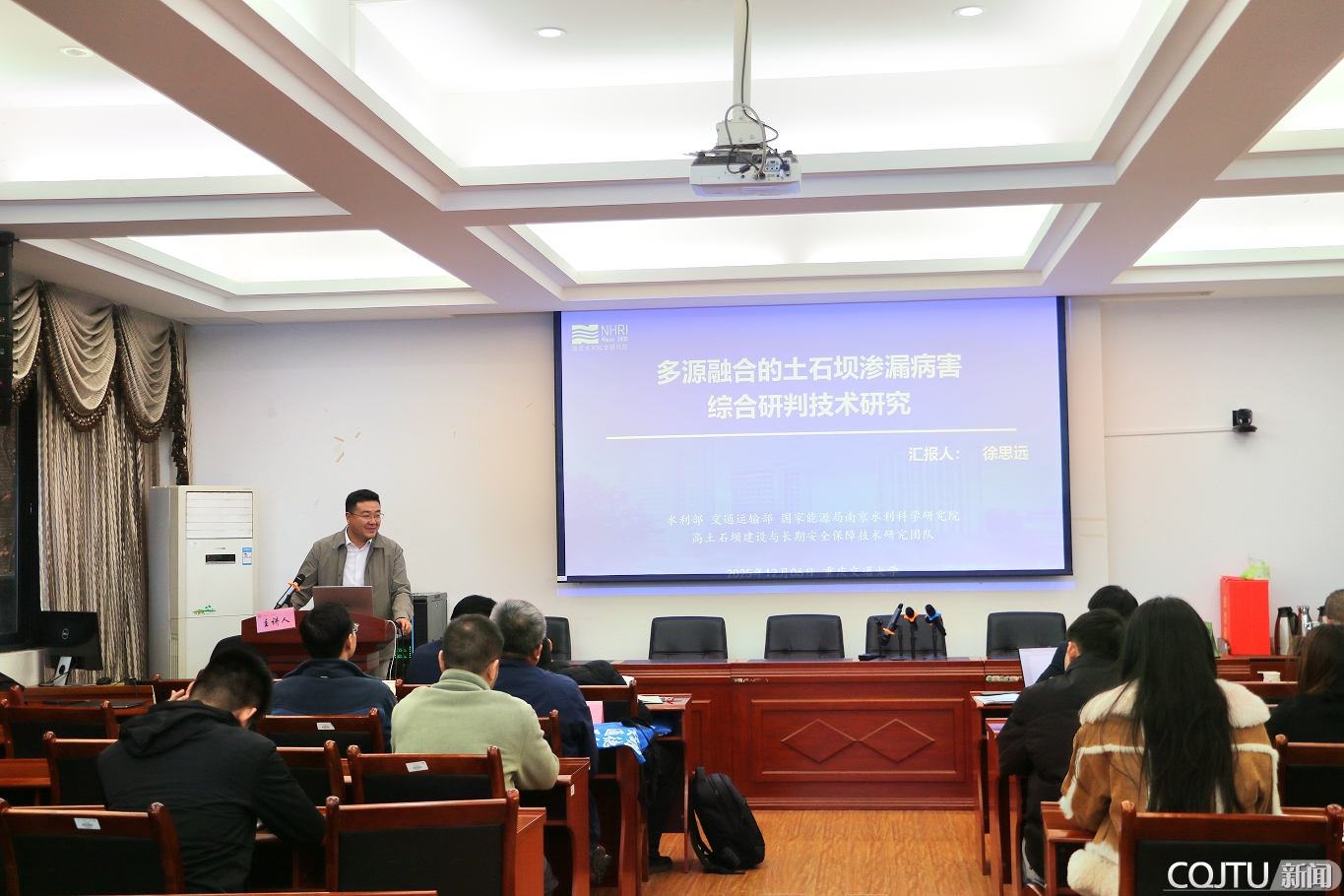 2025年12月6日,由我校牵头建设,重庆科技大学、重庆市水利电力建筑勘测设计研究院有限公司、长江科学院重庆分院、中地装(重庆)地质仪器有限公司等单位参与共建的水工建筑物健康诊断技术重庆市高校工程研究中心(以下简称“中心”)在重庆交通大学隆重召开了2025年学术报告会。本次学术报告会邀请了南昌大学教授蒋水华、河海大学教授甘磊、哈尔滨工业大学(深圳)教授卢雯珺、南京水利科学研究院高级工程徐思远四位知名专家作特邀报告,吸引了水利、岩土专业的教师,以及相关专业研究生80余人参加。