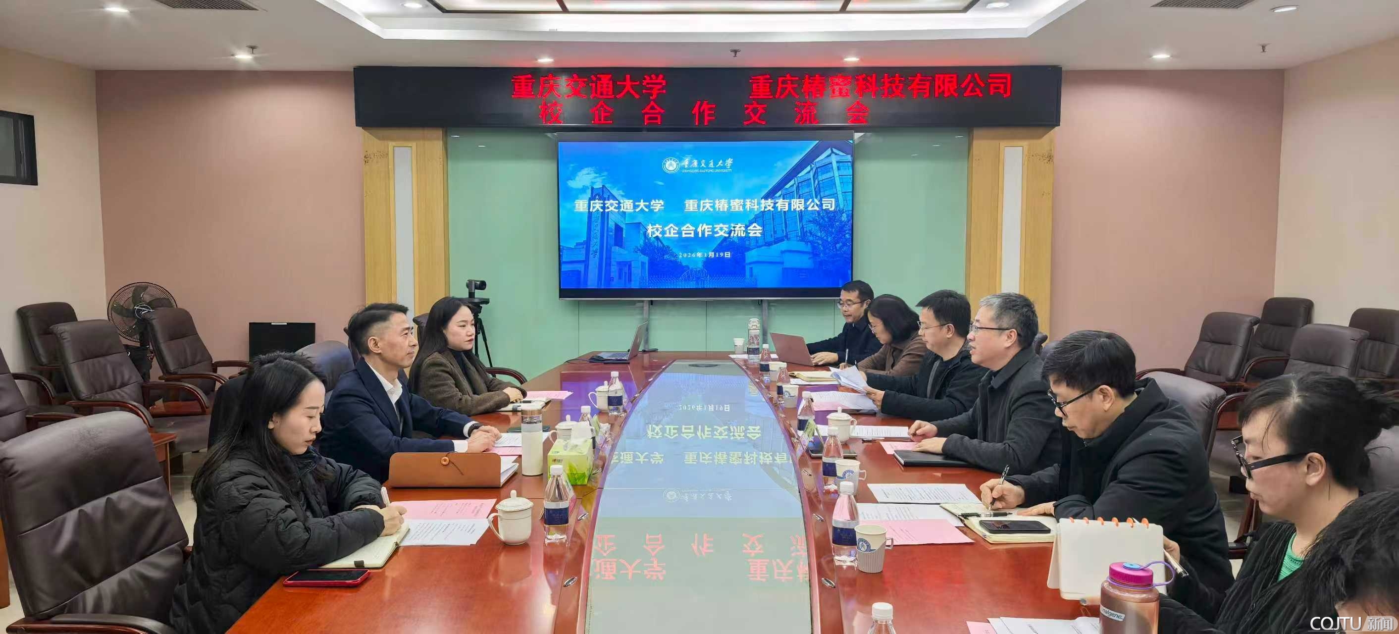 1月19日,重庆椿蜜科技有限公司(以下简称“椿蜜科技”)杨春董事长一行到访重庆交通大学,双方就绿色经济、新能源智慧运力、产教融合等议题进行交流洽谈。校党委副书记张铭,教务处、交通运输学院、信息科学与工程学院、航空学院、智慧城市学院及未来土木科技研究院科研团队参加会谈。