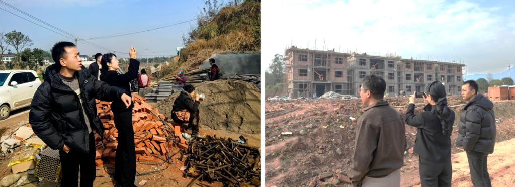 会后,团队前往高安镇、新民镇开展现场调研,与施工人员及村民深入交流。姚阳教授指出,乡村景观营造不仅要“留住乡愁记忆”,更应灵活运用乡土植物与本土材料,构建居民可参与、自然可生长、情感可延续的活力空间,让乡村在发展中依然保有熟悉的温度与生命力。徐辉副教授强调设计应“扎根现场、回应需求”,鼓励师生深化兼具特色与弹性的设计方案。