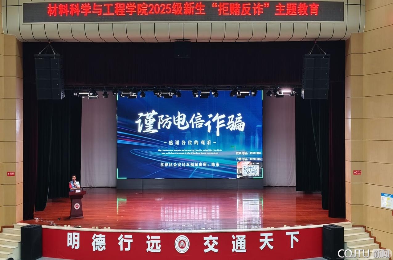 为切实提升2025级新生的安全防范意识,有效遏制校园电信网络诈骗案件发生,9月27日,重庆交通大学材料科学与工程学院在科学城校区学生活动中心二楼报告厅举办“拒赌反诈”主题教育活动。此次宣传活动由重庆双福派出所副所长陈希主讲,学院2025级全体新生参会。