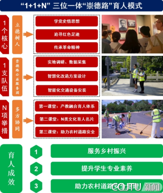 重庆交通大学“崇德路”公益服务团以农村道路安全治理为切入点,整合校企、校友资源,积极构建了“1+1+N”三位一体“崇德路”育人模式,取得了显著成效。通过实践教学、科学研究和社会服务,实现了价值引领、能力培养、社会服务的有机统一和多方共赢。