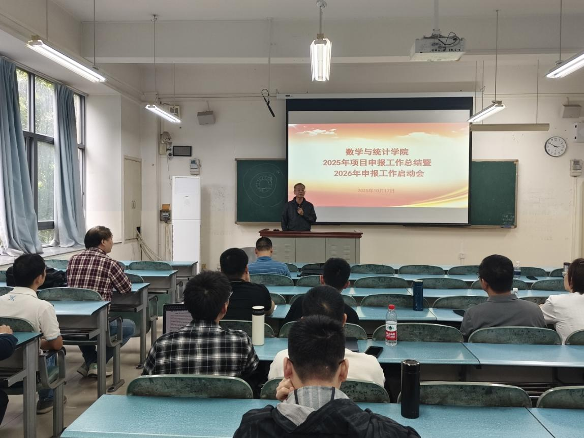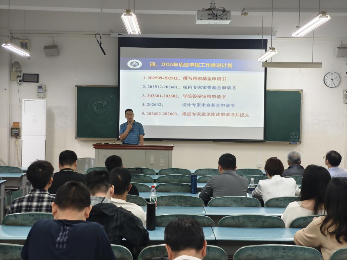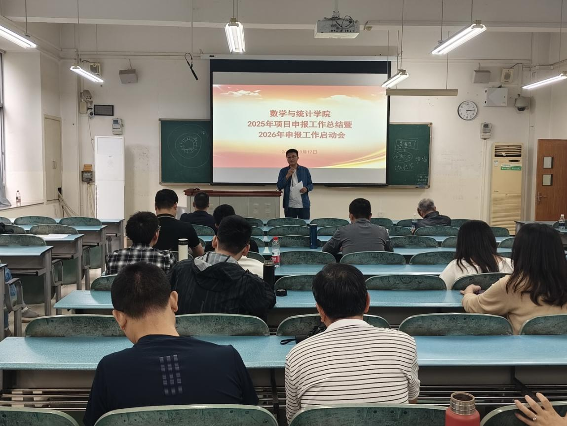 2025年10月17日下午,数学与统计学院2025年基金申报工作总结暨2026年申报工作启动会在南岸校区第二教学楼306教室召开。会议深入复盘2025年度申报成效,精准解读2026年国家自然科学基金政策导向,系统部署下一阶段工作。会议由学院副院长张建军教授主持,院长王其林教授、学科带头人宋乾坤教授及全体拟申报教师参加了会议。