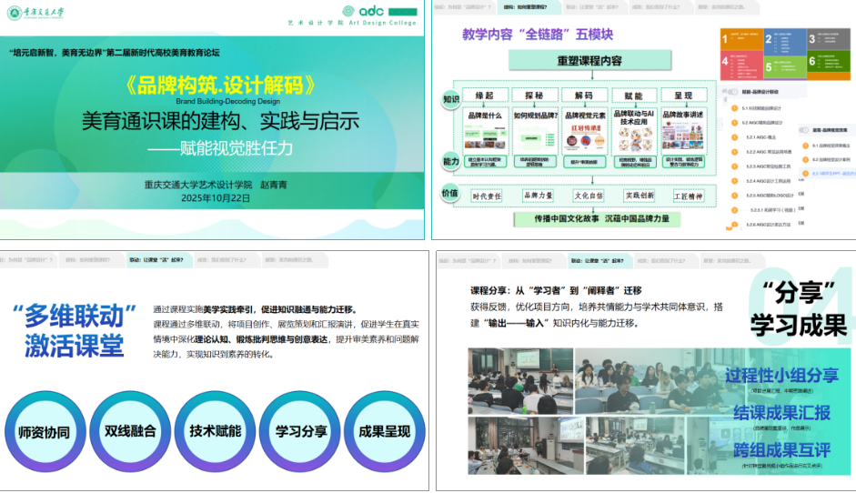 重庆交通大学艺术设计学院赵青青副教授受邀出席,并以《〈品牌构筑·设计解码〉美育通识课的建构、实践与启示》为题作专题报告。该门课程由校美育教研室推选至2024年中国高教学会美育专委会美育浸润推进会,面向全国高校进行展示推广。她系统介绍了该课程是将艺术设计学院的优势专业课程转化为全校共享的美育资源,重点阐释了“课程—实践—创作—展演”联动的美育模式。通过项目创作、展览策划、汇报演讲等多元形式,有效提升了学生的审美素养,显著增强了全校美育活动的参与度与创新力。成为美育浸润行动在大学全面开展的典型案例,为高校美育工作提供了新的思路和范例。