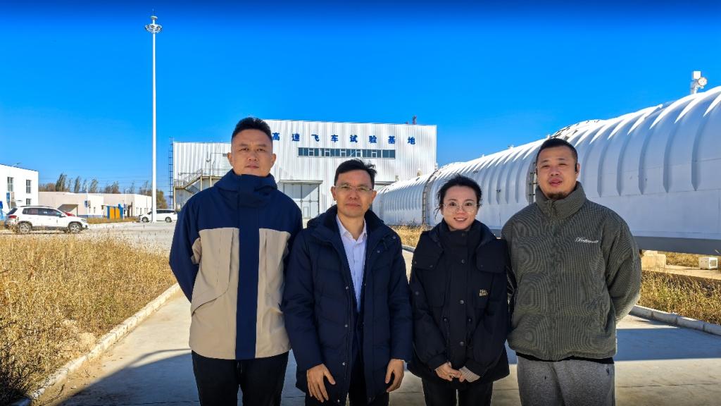 在基地技术负责人陪同下,调研人员参观了基地科技馆。通过实物模型、VR试驾座舱以及飞车实验实景,调研人员系统了解高速飞车“超高速、低真空、磁悬浮”技术原理和交通组织方式。随后,调研人员深入全尺寸试验线,实地调研运行轨道、控制机构、泵站等节点,针对座舱布局、视觉导视、运营维护、应急疏散等设计痛点,与基地负责人进行交流。
