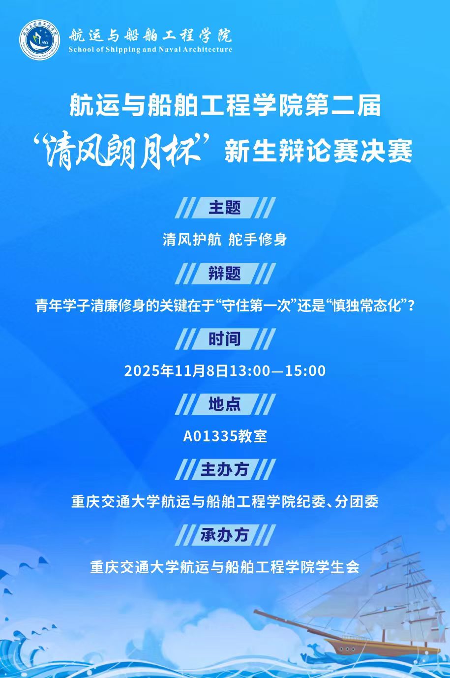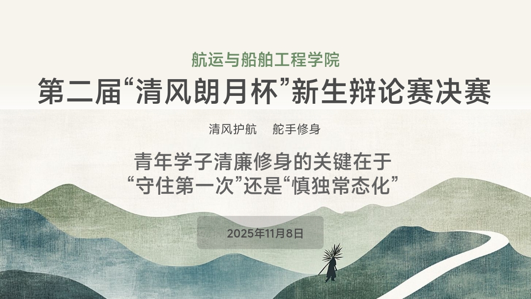 2025年11月8日,航运与船舶工程学院第二届“清风朗月杯”新生辩论赛决赛在科学城校区A01335教室精彩收官。此次辩论赛以“青年学子清廉修身的关键在于‘守住第一次’还是‘慎独常态化’”为主题,聚焦大学生廉洁成长核心议题,吸引了全院师生的广泛关注与热情参与。