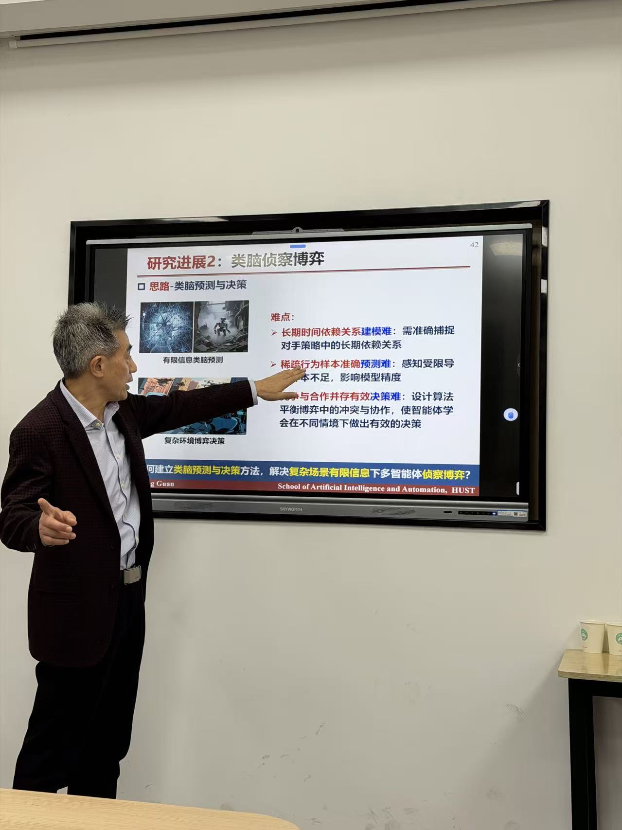 随后华中科技大学关治洪教授接棒开讲,以《类脑混合智能及无人系统研究》为主题,聚焦无人系统在复杂场景中的核心挑战展开分享。作为首批“华中学者领军岗教授”、爱思唯尔高被引学者,关治洪教授在脉冲混杂系统、多智能体系统等领域成果丰硕,曾获教育部自然科学一等奖、湖北省自然科学一等奖等重要奖项。