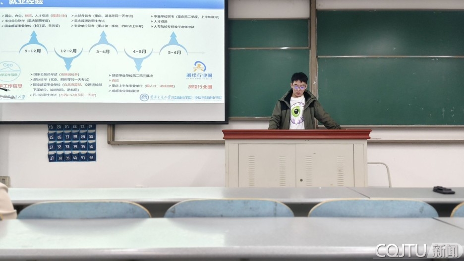 向万淋,现就职于重庆市巴南区规划和自然资源局。他从学习经历、升学、就业等三个方面,与同学们进行了分享。然后,他就保研、考研等方面给出了自己的“经验小窍门”,如积极参加科研项目和心仪学校夏令营,主动与老师联系等。同时,他对企业和考编的待遇、机会、竞争等方面进行了简单比较,建议同学们明确自己想要什么样的生活,加以考虑工作地点等。他强调,考编需结合自身职业规划,提前了解岗位需求与地域政策。向万淋校友还分享了一份各类招聘考试的时间表和两个优质招聘类公众号——地学工作信息和测绘行业圈。最后他衷心告诫同学们,提前准备,而不是提前焦虑。