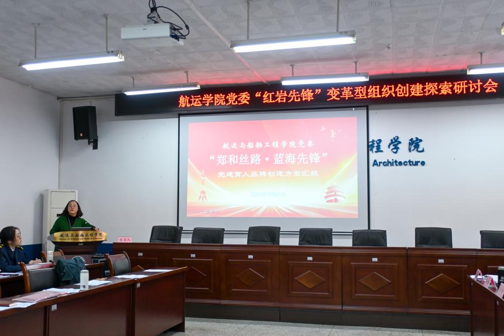 围绕“红岩先锋”变革型组织创建探索,在前期大量丰富扎实的创新实践基础上,受学院党委委托,正处级组织员兼纪委书记李世佼系统阐述了“郑和丝路·蓝海先锋”党建品牌建设构想。她指出,“郑和”象征中华海洋文明的开放包容,“丝路”呼应“一带一路”倡议下的全球互联互通,“蓝海先锋”则彰显党员在海洋强国征程中的先锋本色。品牌拟以“丝路传承千秋韵,先锋奋进向深蓝”为口号,构建“1+5+N”党建思政育人矩阵,实施五大专项行动,着力破解党建与业务“两张皮”难题,以高质量党建统领学院事业全方位高质量发展。