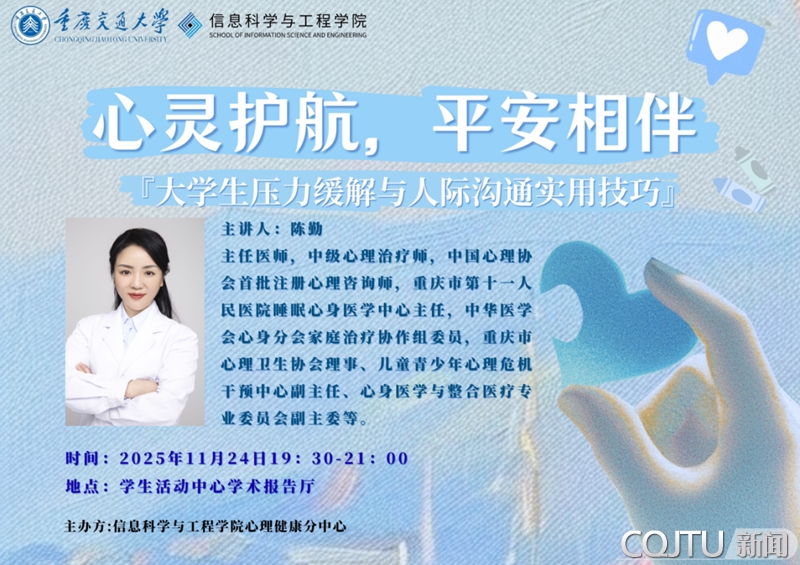 信息科学与工程学院高度重视关心同学们身心健康和学业情况,为扎实推进学生心理健康教育工作,筑牢低年级学生心理健康防线,帮助学生更好应对学习压力、提升人际沟通能力,11月24日19:30,心理健康分中心在科学城校区学生活动中心学术报告厅举办“大学生压力缓解与人际沟通实用技巧”专场心理健康讲座。