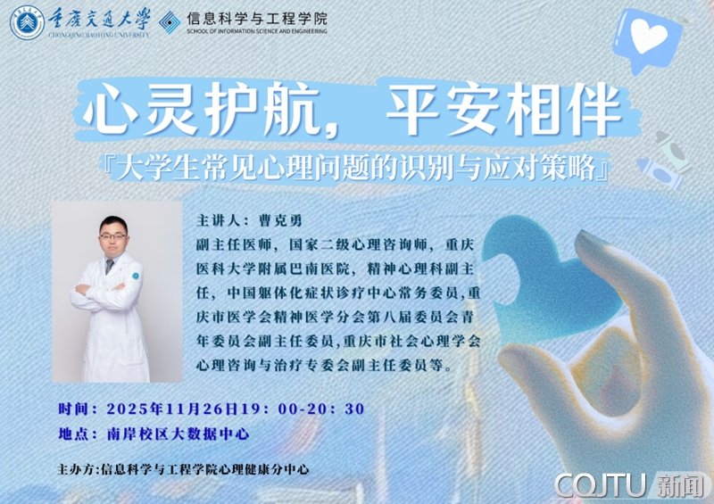 信息科学与工程学院高度重视关心同学们身心健康和学业情况,为落实心理健康教育与服务,助力学生识别与应对常见心理问题,信息科学与工程学院心理健康分中心举办的“心灵护航,平安相伴”心理健康系列专题讲座Ⅱ——“大学生常见心理问题的识别与应对策略”,于11月26日19:00,在南岸校区大数据中心拉开帷幕。
