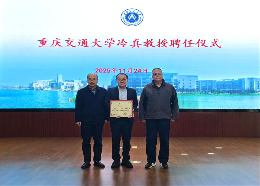 王俊杰院长致欢迎词并介绍了冷真教授的履历及学术成就,随后宣读聘任文件。学院党委书记周平与院长王俊杰共同为冷真教授颁发特聘教授聘书。冷真教授对学校的信任与认可表示感谢,他表示将依托重庆交通大学的学科平台优势,聚焦交通领域"双碳"目标,深化废弃物再生沥青材料研究,推动产学研协同创新与成果转化,为学校学科建设和行业高质量发展贡献力量。