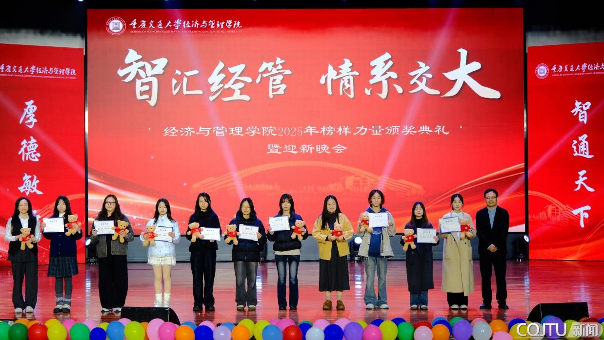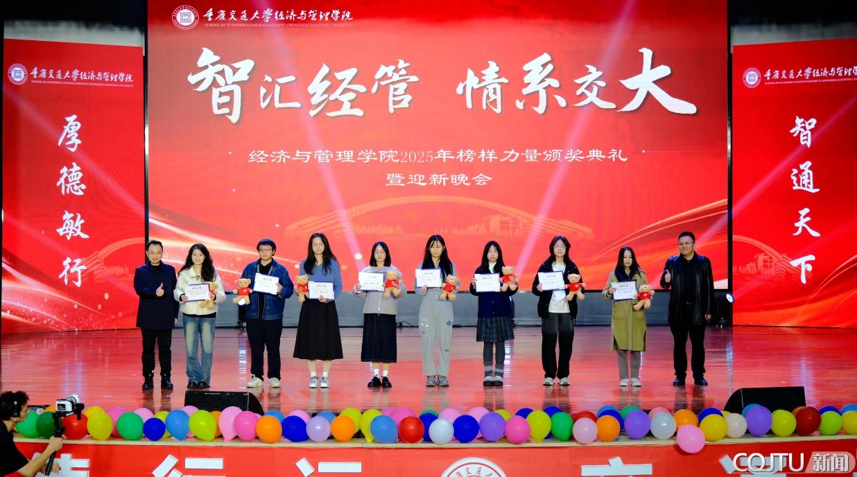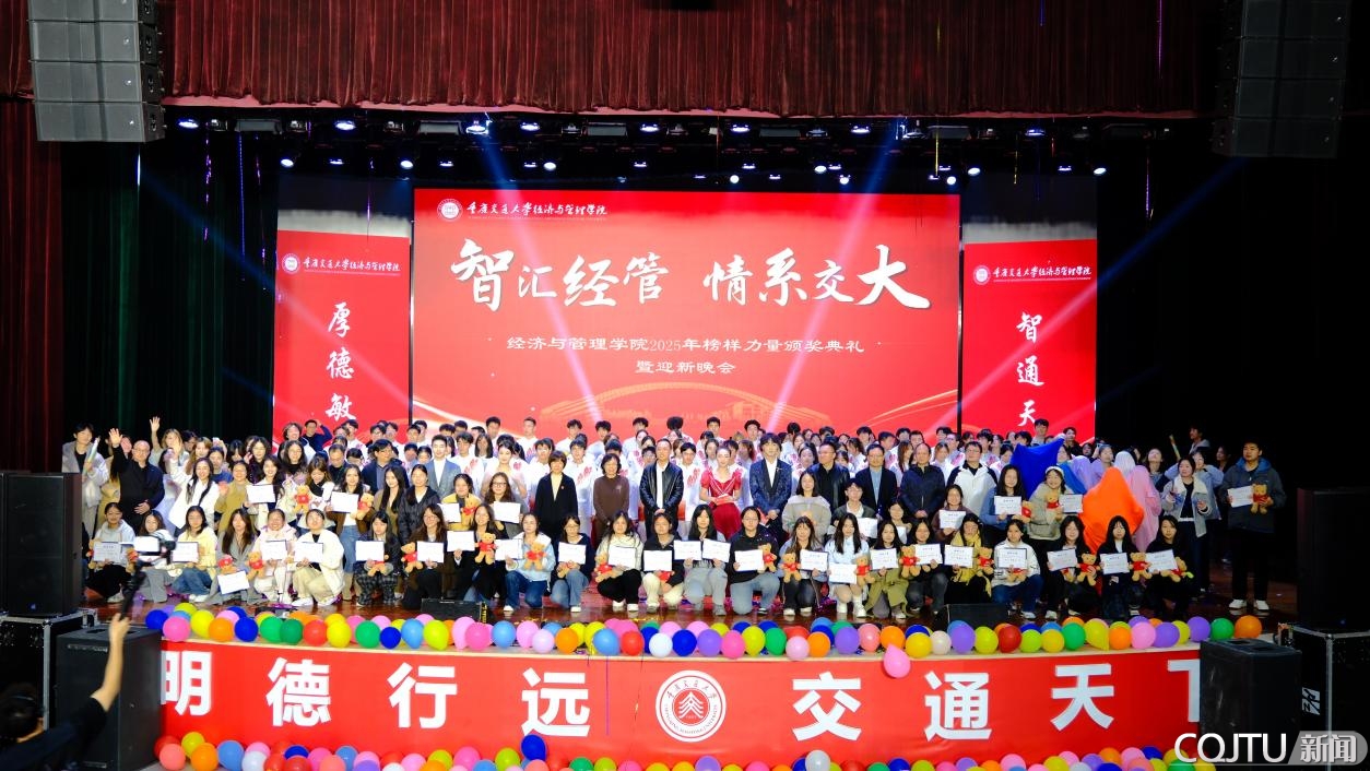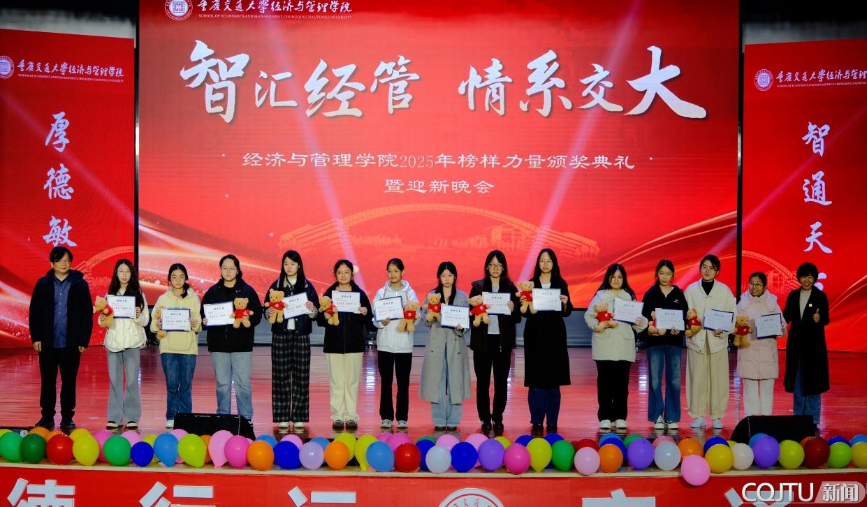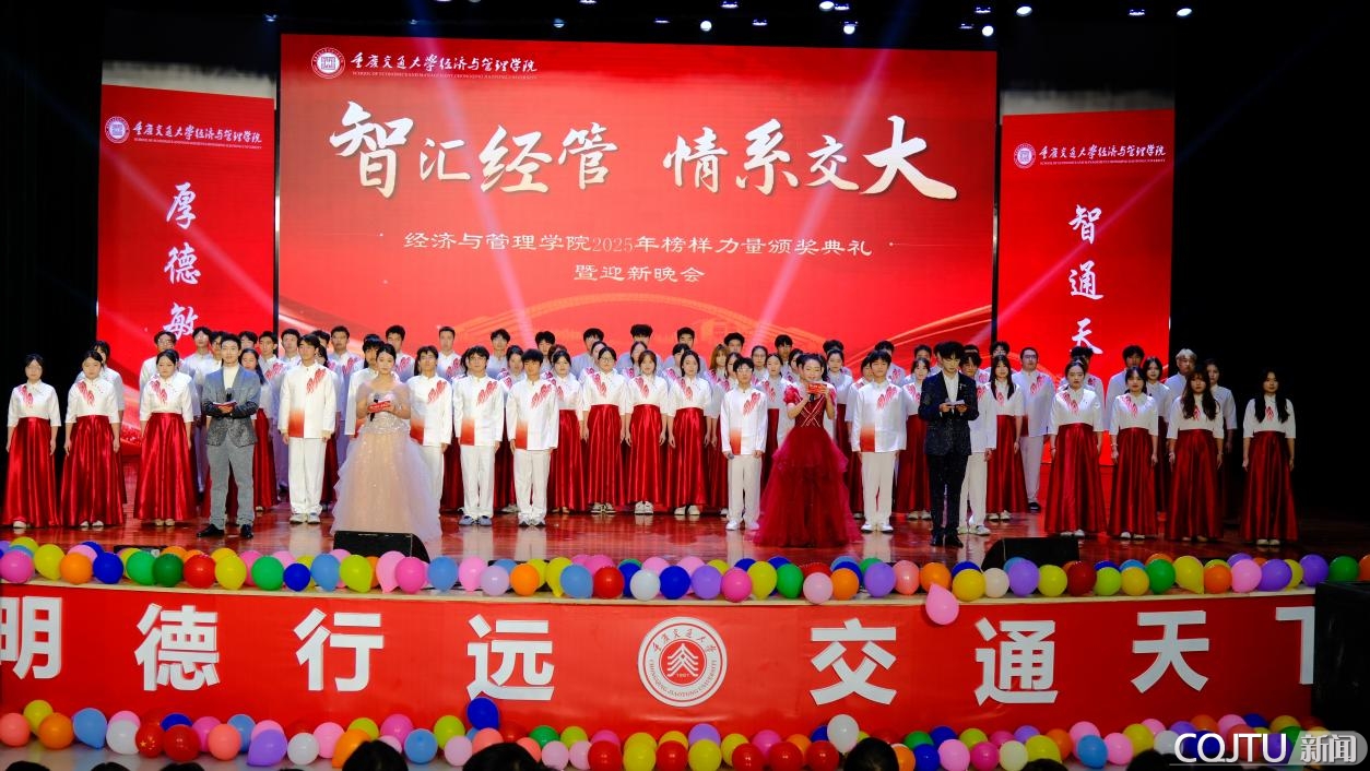 2025年11月30日18:30,重庆交通大学科学城校区学生活动中心二楼学术报告厅灯火璀璨,“智汇经管,情系交大”——经济与管理学院2025年榜样力量颁奖典礼暨迎新晚会隆重举行。党委学生工作部副部长金春寒、校团委副书记揭财明、科学城学院副院长陈先宇、经管学院党委书记尹作发、院长李红镝、党委副书记吉孟君、副院长李豪、副院长张子健、各系教师代表以及700余名学生齐聚一堂,共同见证这场以榜样为核心的青春盛宴。