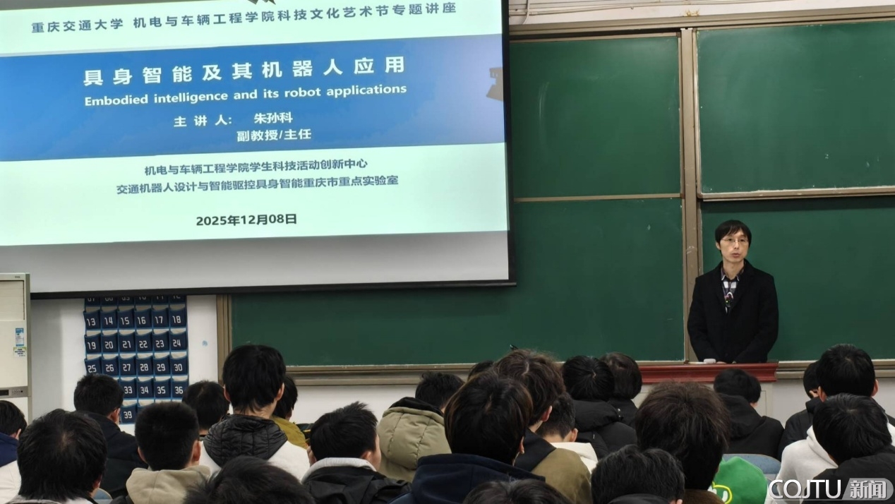 为深化跨学科交流、赋能学生科技认知,12月8日,由重庆交通大学校团委与机电与车辆工程学院联合主办的第七届科技文化艺术节系列活动——“具身智能及其机器人应用”专题讲座,在科学城校区A01107教室顺利举行。讲座面向全校学生开放,吸引了来自不同学院、不同专业的同学踊跃参与,现场座无虚席,互动氛围热烈,大家共同解锁前沿科技领域的知识密码。