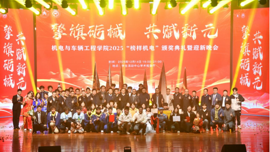 旗帜,在立德树人的高地飘扬;匠心,在科技报国的熔炉淬炼。2025年12月14日晚,机电与车辆工程学院2025年度“榜样机电”颁奖典礼暨迎新晚会在科学城校区学生活动中心学术报告厅圆满举行。本次盛会以“擎旗砺械·共赋新元”为主题,既是对过往奋斗的崇高致敬,更是对崭新征程的豪迈宣言。校党委常委、党政办主任杨既福,校党委委员、学工部部长万宇,校党委委员、科技处处长徐向阳,招生就业处处长舒琳,教务处副处长何泽银,校团委副书记揭财明,科学城学院副院长王鹤,学院杰出校友代表、全体班子成员与七百余名师生欢聚一堂,共同见证荣耀,感受薪火相传的磅礴力量。