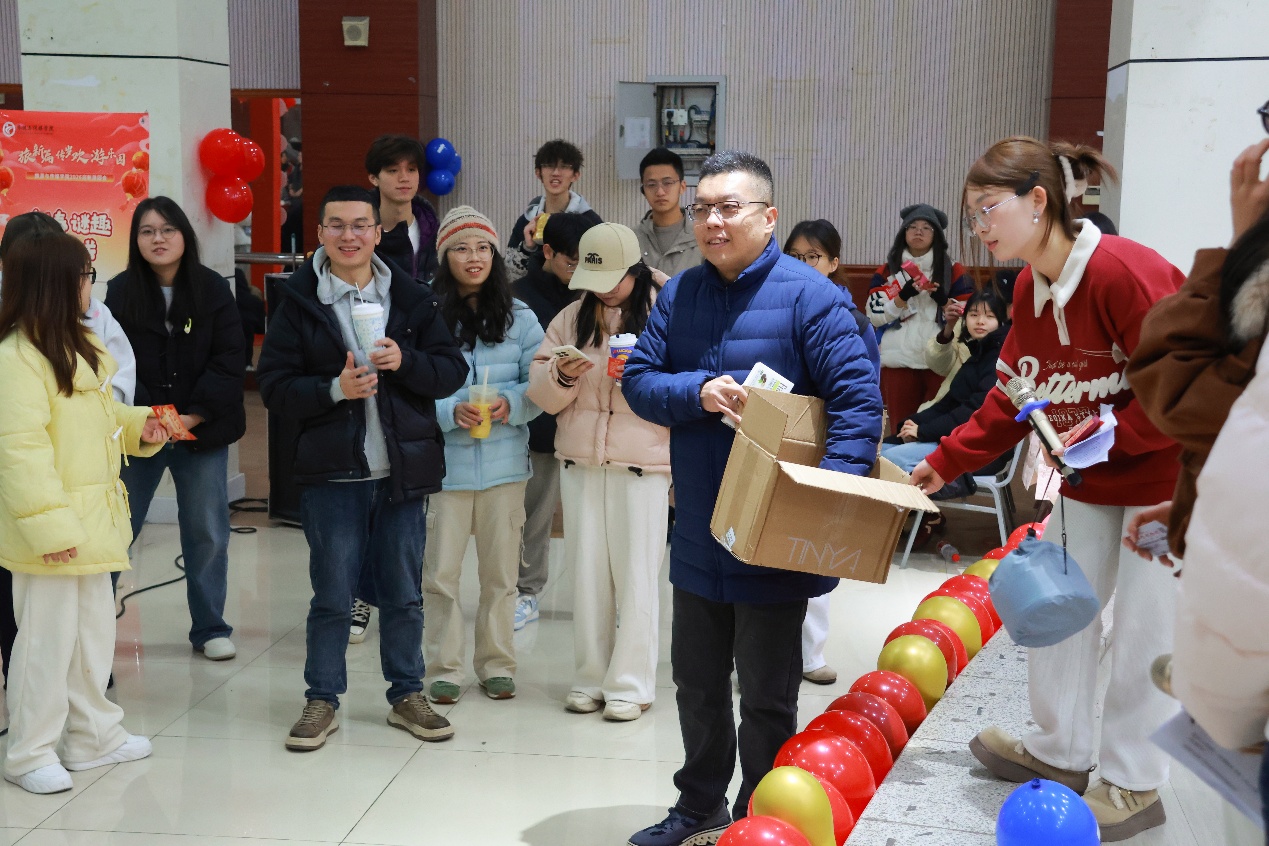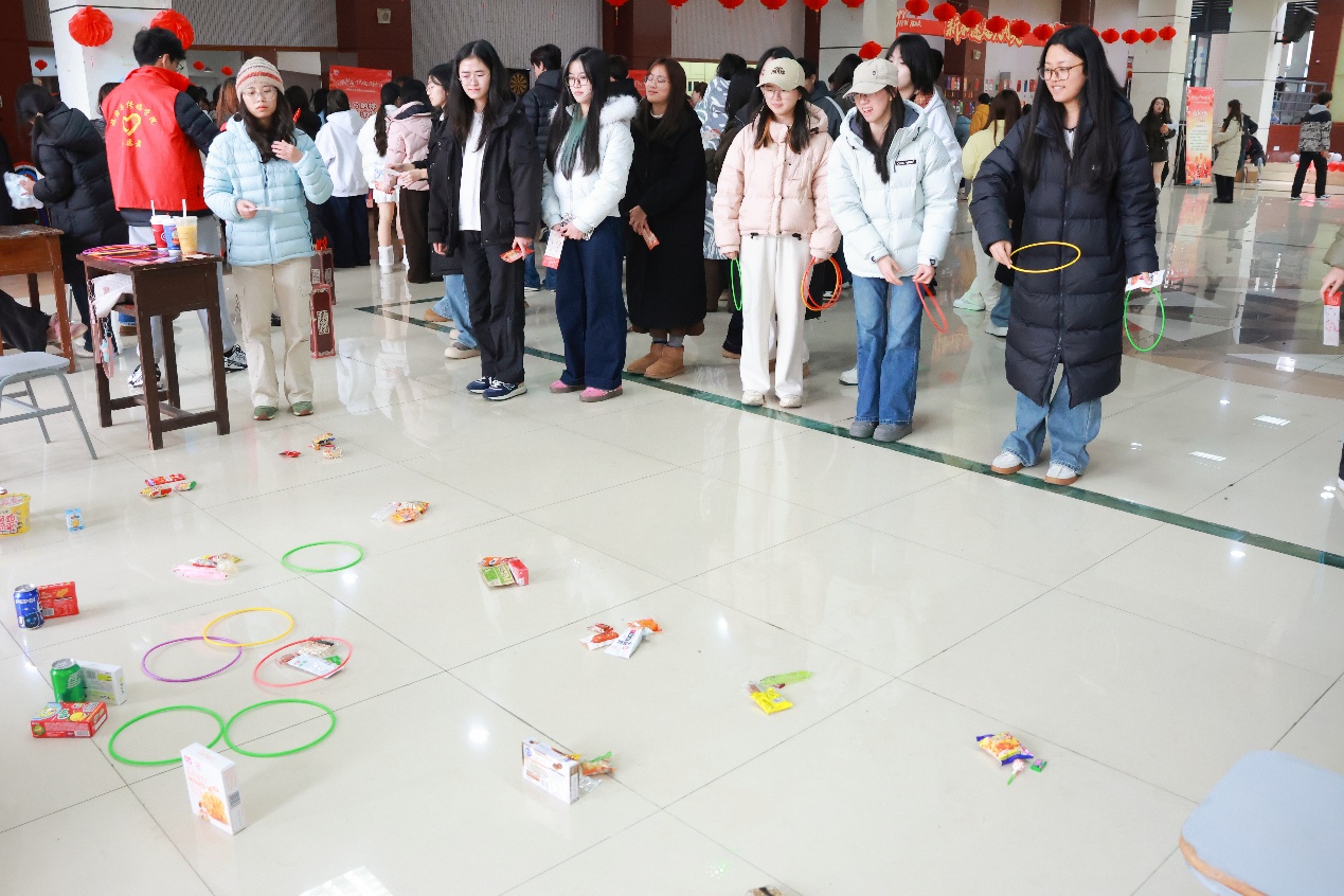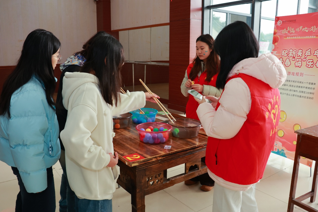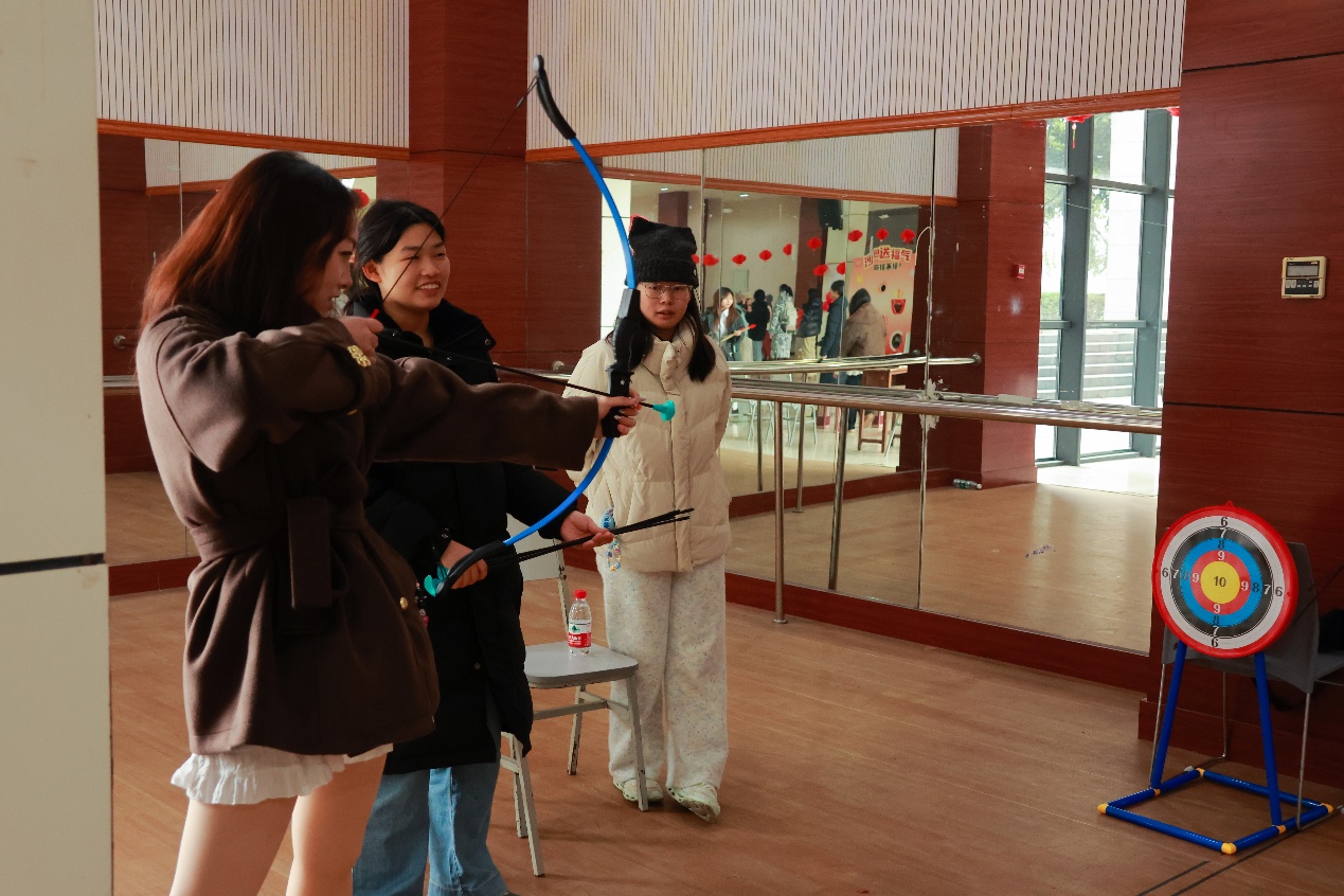 “迎新夹乒乓” 项目暗藏突破舒适区的创新精神,考验着同学们的耐心与灵活应变能力;“拉弓纳祥” 不仅锤炼专注力与精准度,更巧妙呼应了学院对学子专业素养的培养需求,引导大家在学习与实践中精益求精;“投壶” 项目则让同学们在古朴的游戏中体悟专注的力量,寓意着新的一年里能够精准达成自己设定的各项目标。每个项目前都排起了长队,同学们热情高涨,相互鼓劲、默契配合,游园现场欢声笑语不断,暖意融融。