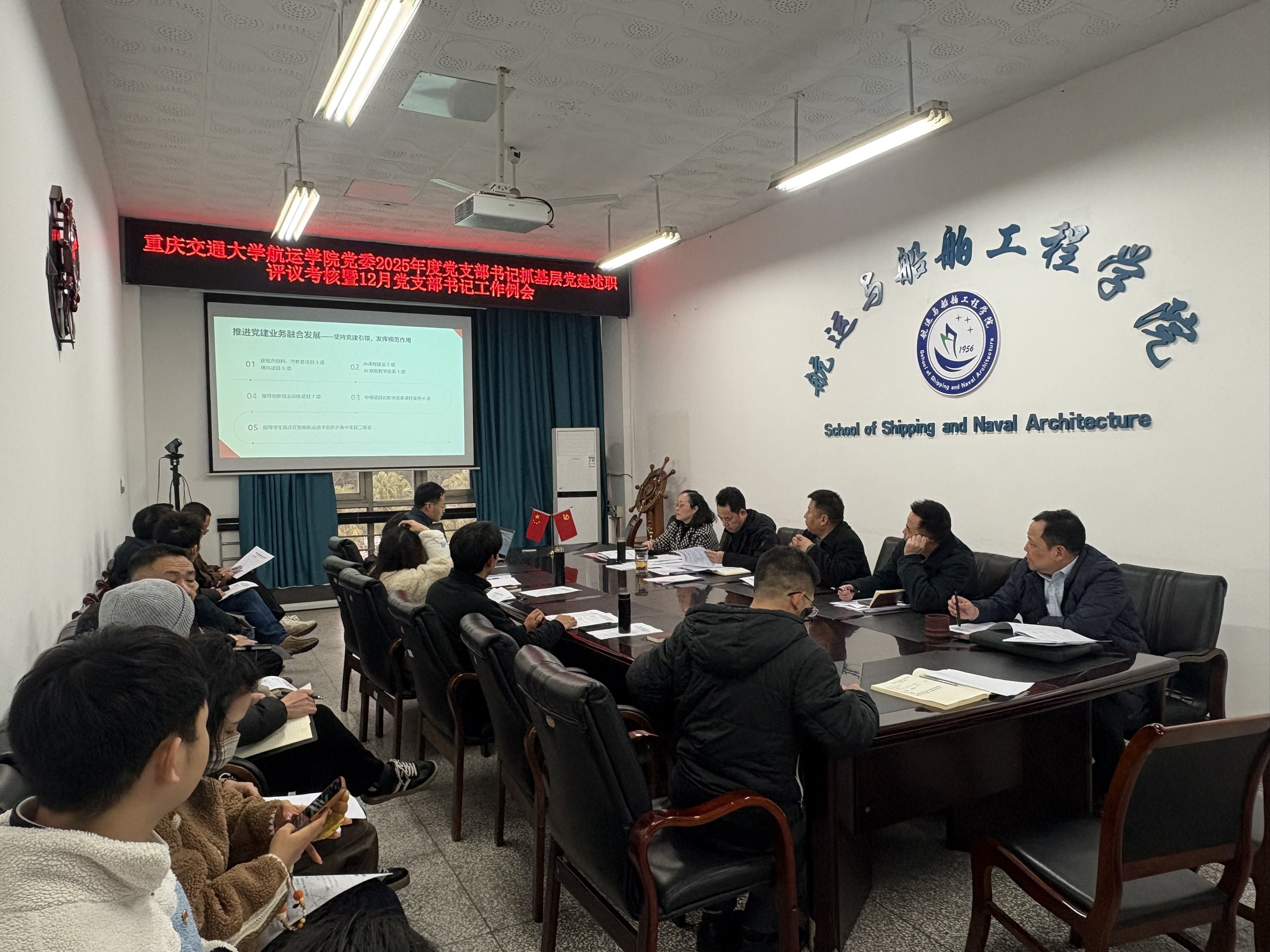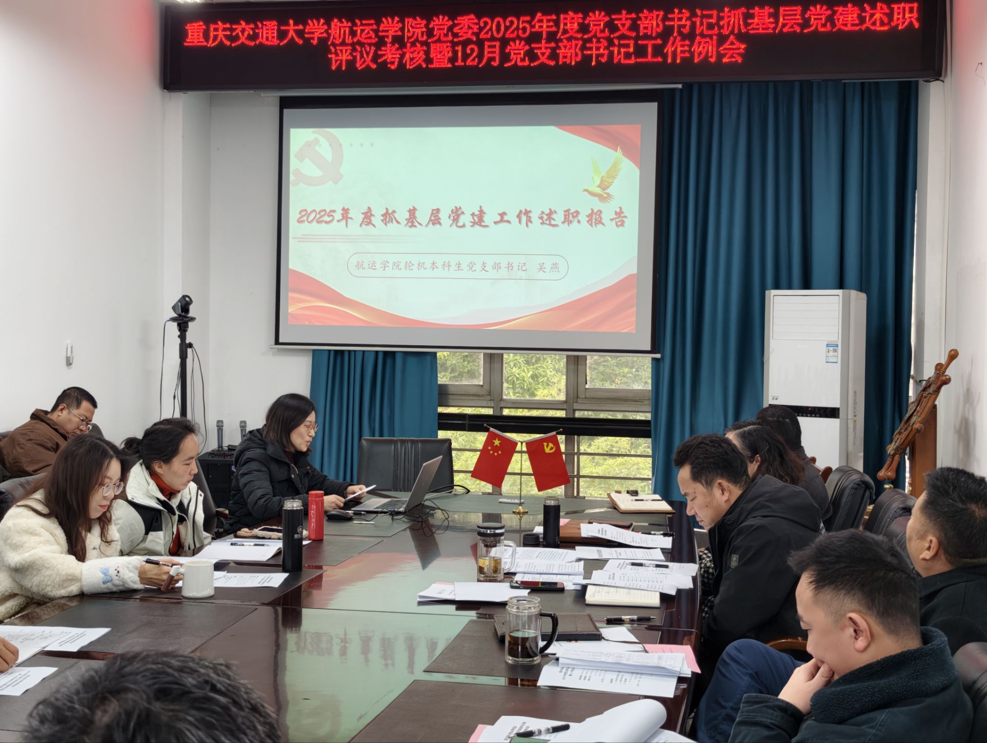 2025年12月29日上午10:30,重庆交通大学航运学院党委在学院第二会议室召开2025年度党支部书记抓基层党建述职评议考核暨12月党支部书记工作例会。会议由学院党委书记周德贵主持,全体党委委员、纪委委员,工会教代会代表任亦然、尹朝忠、刘顺强,党员群众代表李锐、吕修颐,以及各党支部书记、副书记和支部委员等近40人参加会议。