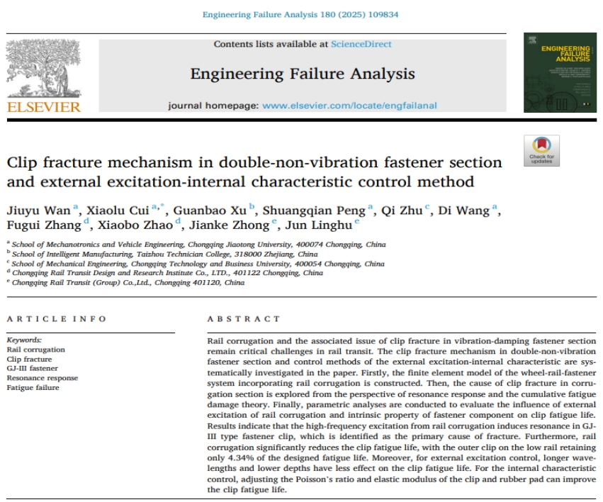 2023级机械工程学术学位硕士研究生万久渝(导师:崔晓璐)在中科院一区Top期刊《Engineering Failure Analysis》上发表题为“Clip Fracture Mechanism in Double-Non-Vibration Fastener Section and External Excitation-Internal Characteristic Control Method”的研究论文,针对钢轨波纹磨损以及与之相关的减振扣件区段弹条断裂问题这一轨道交通领域面临的关键,系统研究了双非振动扣件区段的弹条断裂机理以及外部激励-内部特性的控制方法。