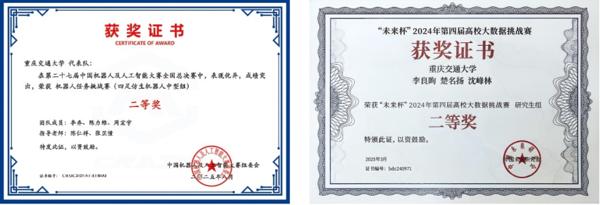 在鼓励自由探索的同时,学院积极组织和支持研究生参与各类高水平科技竞赛,以赛促学、以赛促研。2025年,学院研究生团队在多项赛事中表现优异,成绩斐然,共获国家级竞赛奖励11项,其中1等奖2项、二等奖4项、三等奖5项;获部级竞赛奖励20项,其中特等奖2项、一等奖2项、二等奖9项、三等奖7项。2023级机械专业研究生王国鑫、王仕琦、黄俊、王丽花(指导教师:崔晓璐)共同完成的《轨道损伤智能巡检机器人》获中国研究生机器人创新设计大赛全国三等奖,这是我校首次在中国研究生机器人创新设计大赛获得奖项,实现该项赛事的历史性突破。