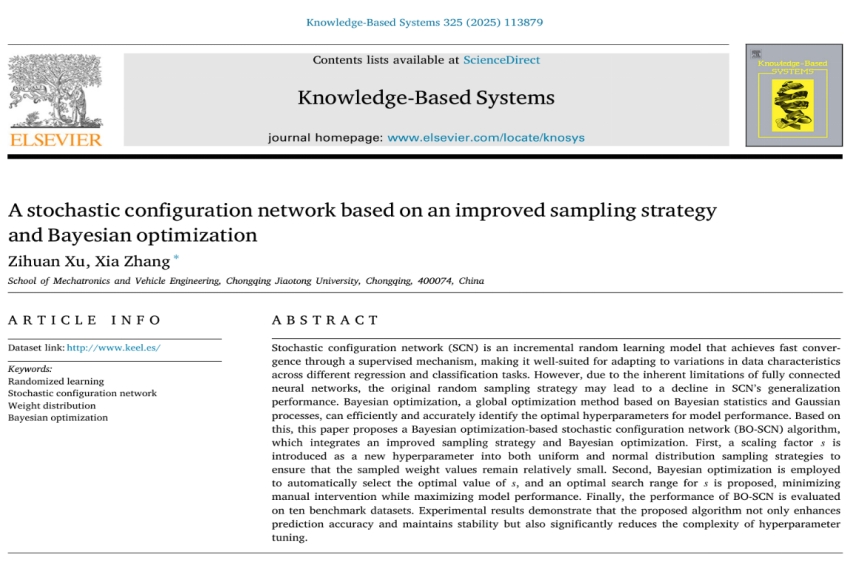 2022级机械专业学位硕士研究生徐梓桓(导师:张霞)在中科院一区Top期刊《Knowledge-Based Systems》上发表题为“A stochastic configuration network based on an improved sampling strategy and Bayesian optimization”的研究论文,提出的融合改进采样策略与贝叶斯优化的随机配置网络(SCN)算法,解决了传统SCN在处理复杂任务时模型性能下降和依赖人工调参的核心问题,突破了传统SCN在此类任务中的性能瓶颈。
