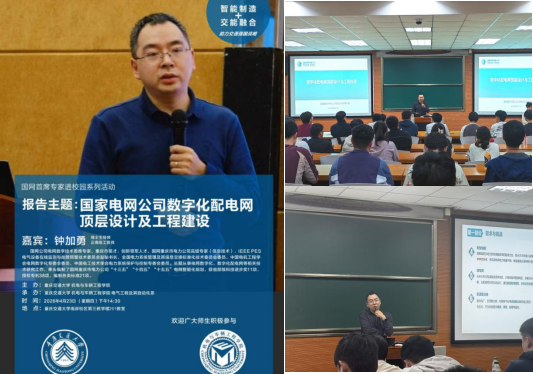 4月23日下午,机电与车辆工程学院在南岸校区成功举办了国网首席专家进校园报告会,特邀国家电网公司电网数字技术首席专家、正高级工程师钟加勇,作题为《国家电网公司数字化配电网顶层设计及工程建设》的专题报告。本次讲座旨在搭建产学融合平台,帮助电气工程及其自动化专业本科生、能源与动力专业研究生等不同层次学生,深入了解电力行业数字化转型趋势,拓展专业视野,明确未来发展方向。