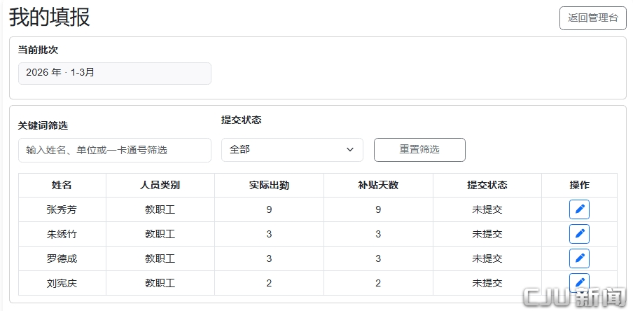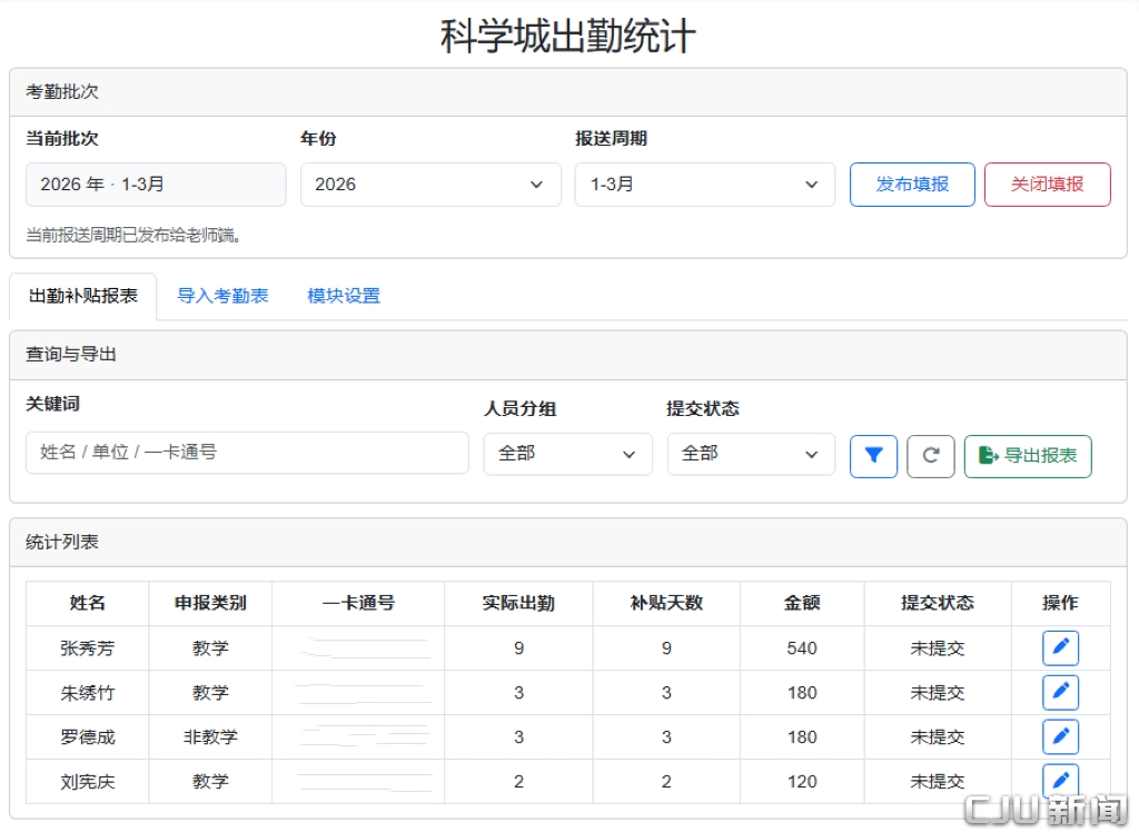 聚焦科学城出勤统计业务流程中“统计口径分散、人工核算繁琐、数据反复校对”等实际问题,学院坚持需求导向和应用导向,以便利老师们填报,提高流程效率为目标,围绕考勤导入、课表同步、教师填报、分类统计、报表导出等关键环节开展系统化建设,初步形成了覆盖“数据采集、过程处理、结果输出”的业务闭环。教师可通过系统入口在线填报出勤情况和工作类别,管理人员可结合报送周期、人员信息和填报状态进行统一维护与审核,系统则依据设定规则自动完成出勤天数与金额统计,显著减轻了人工整理和重复核验负担。