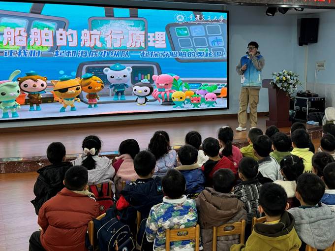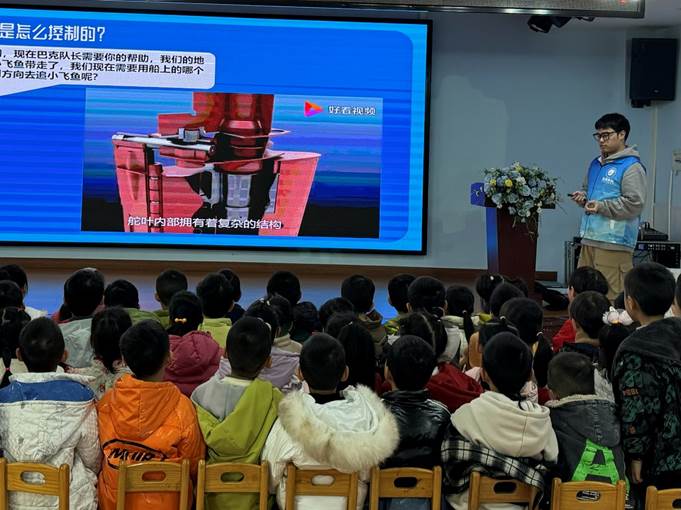 在螺旋桨发力与船舶转向环节,志愿者们通过动画片段截取、简易模型演示等方式,将复杂的机械原理转化为童趣化表达:“螺旋桨就像小鱼的尾巴,快速转动时能推动船舶前进”,“船尾的方向舵就像我们的方向盘,转动它就能改变航行方向啦!”