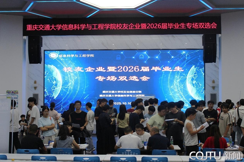 2025年10月10日,重庆交通大学信息科学与工程学院校友企业暨2026届毕业生专场双选会,在南岸校区第一教学楼智慧交通大数据中心圆满落下帷幕,信息科学与工程学院党委书记王辉老师、院长杨建喜老师、党委副书记蒋攀老师、辅导员彭娅、王延鹏和胡小容老师亲临现场,学校招生就业处处长袁理老师、就业市场建设科科长彭晋老师也到双选会现场指导工作。本次双选会得到了学校校友会信息分会、产学研处的支持帮助,双选会圆满举办为2026届毕业生搭建了精准对接的就业平台,更成为学院链接校友资源、深化校企合作的重要纽带。