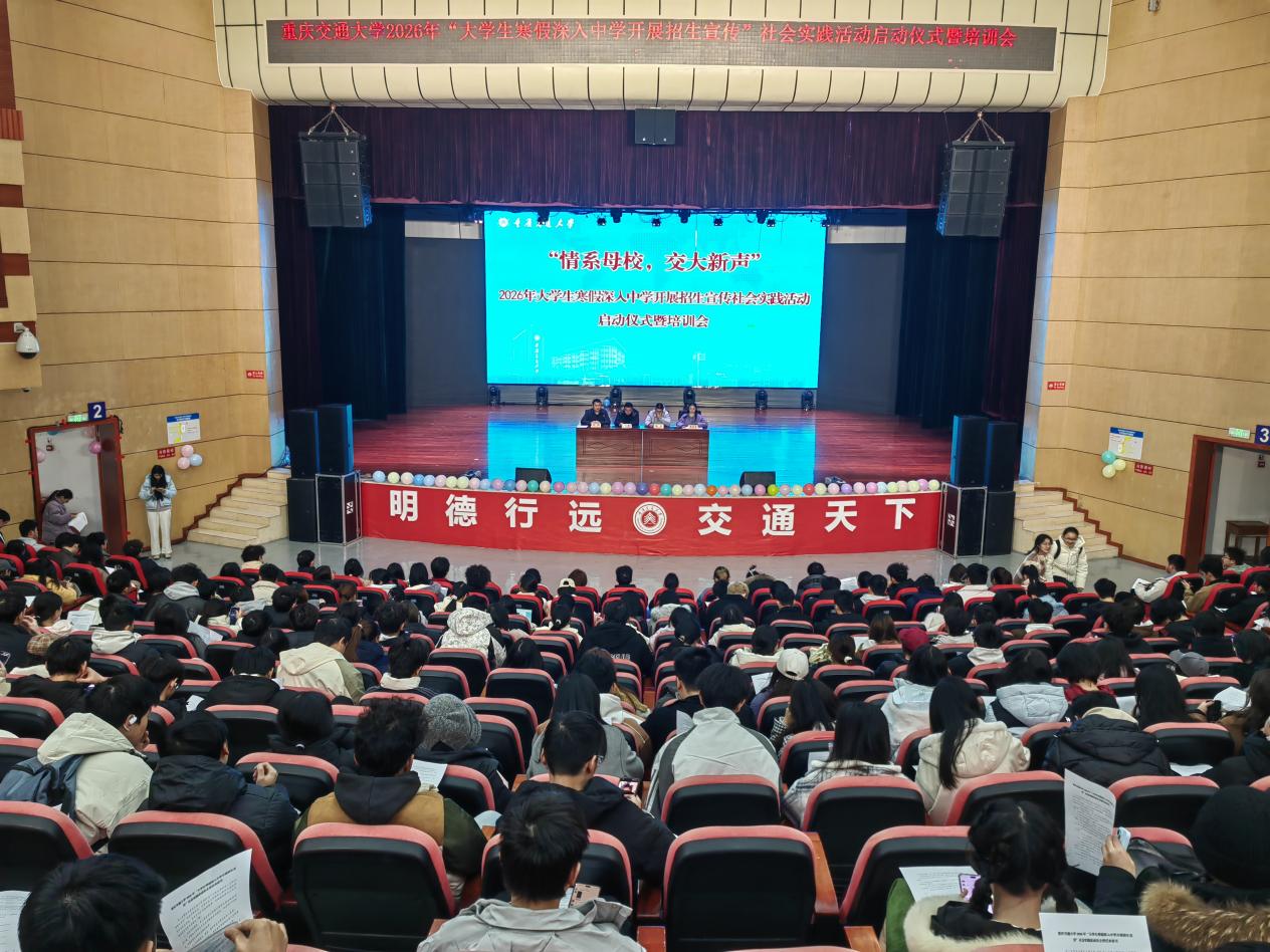 12月26日中午,重庆交通大学在科学城校区学生活动中心学术报告厅举行2026年“情系母校,交大新声”大学生寒假深入中学招生宣传社会实践活动启动仪式暨培训会。校团委、招生就业处、保卫处相关负责人及参与活动的全体学生参会。会议由招生就业处招生科科长付辉主持。