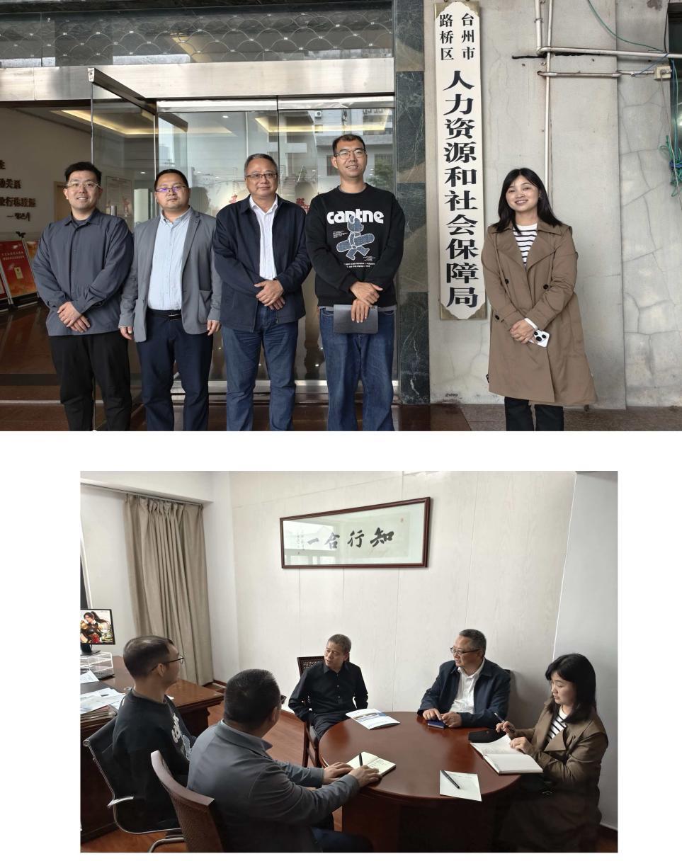 4月13日上午,调研组实地走访台州市路桥区人才产业园综合服务中心,了解园区建设、人才服务与校企合作落地情况,就共建就业实习基地、成果转化等深入沟通。随后,调研组与路桥区人社局局长吴卫明、副局长任守超、党组委员俞翔座谈。吴卫明介绍当地主导产业布局、人才政策与紧缺岗位需求,期待建立长期人才输送与科研合作机制。周平介绍学院学科特色与人才培养成果,希望深化校地合作,实现供需精准对接、校地共赢。