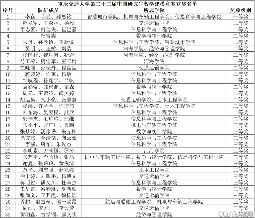 本届竞赛我校获奖丰硕:32队研究生获奖,其中,一等奖1队、二等奖16队,三等奖15队;1名教师获“先进个人”(全国共评选出73人),学校获优秀组织奖(全国参赛631所培养单位中仅65所获此殊荣)。