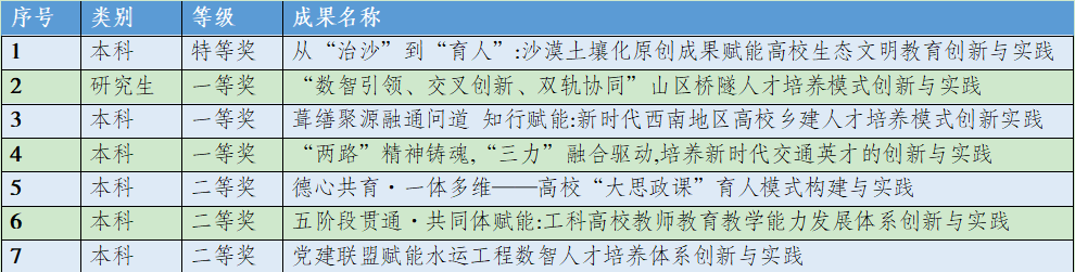 近日,重庆市人民政府发布了《关于2025年重庆市教学成果奖励的决定》(渝府发〔2025〕17号),对全市涌现出的优秀教学成果予以表彰。我校共获得奖励7项,其中特等奖1项、一等奖3项、二等奖3项,展现了学校高质量教育体系建设的显著成效。