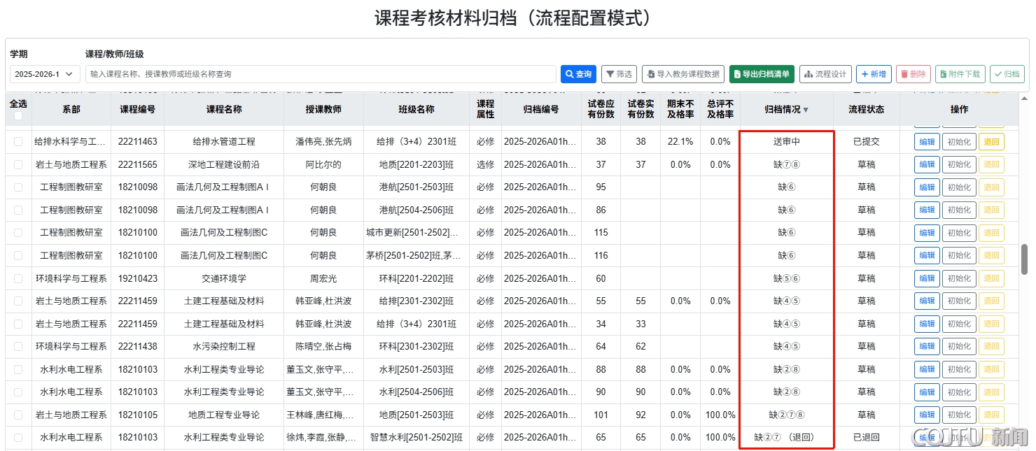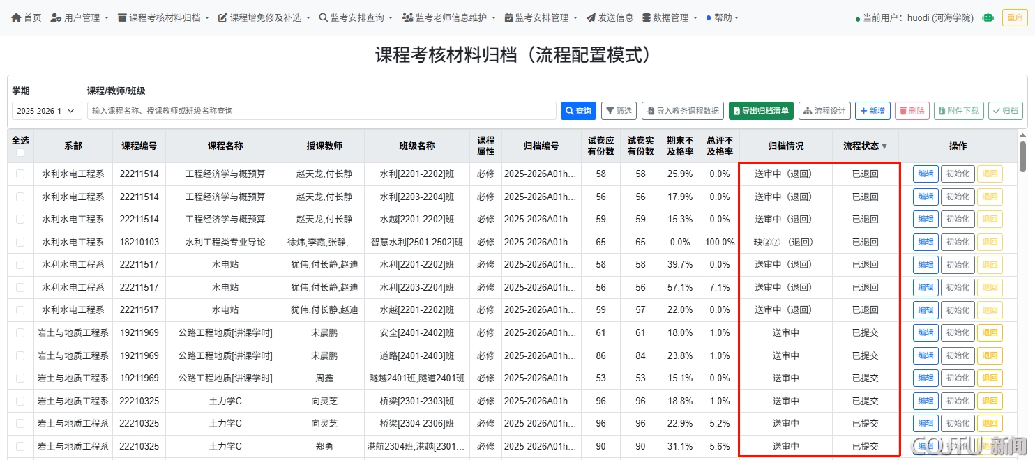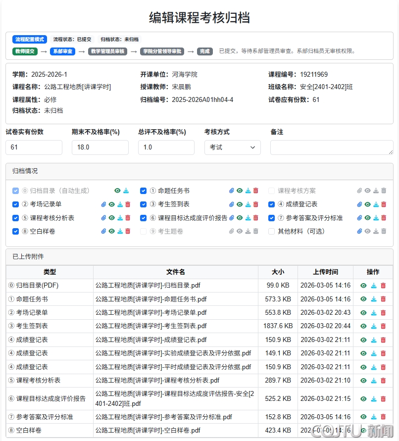 数字化赋能,破解教学管理痛点。课程考核材料归档是教学运行的核心环节,传统模式下存在“材料种类多、人工审核耗时长、反复修改成本高”等问题。河海学院以“考务通”平台为抓手,打通线下材料整理、线上提交、系统智能审查材料完整性、归档目录自动生成、多角色流程审批、审批记录留痕等关键环节,实现“线下跑腿”向“线上协同”的转变: