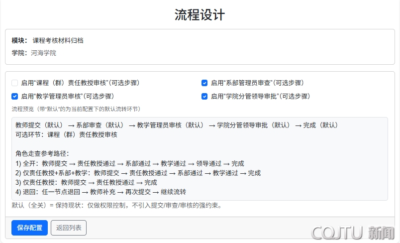 管理端升级:责任教授、系部、教学办、院领导等多角色在线审批,审批意见与操作全程留痕,确保流程透明、责任可追溯;