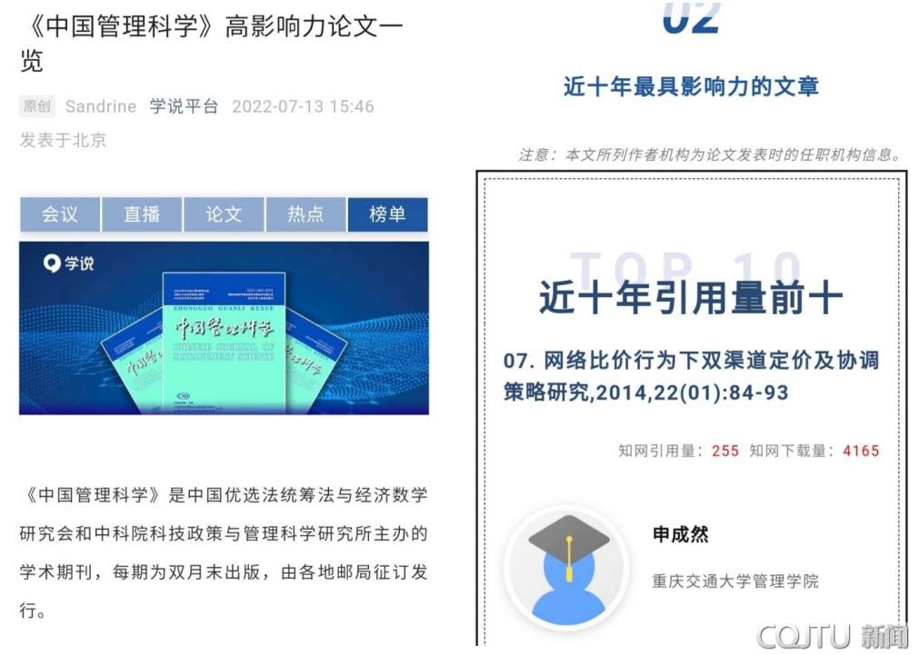 近日,《中国管理科学》发布高影响力论文一览,重庆交通大学经管学院申成然副教授论文《网络比价行为下双渠道定价及协调策略研究》(2014,22(01))以知网引用量255、知网下载量4165入选近十年最具影响力的文章、近十年引用量前十文章。