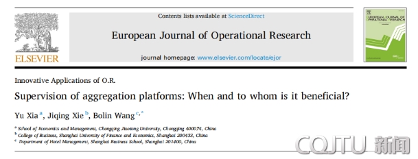近日,重庆交通大学经济与管理学院夏宇博士以第一作者身份在国际权威期刊European Journal of Operational Research在线刊发了研究成果“Supervision of aggregation platforms: When and to whom is it beneficial?”。该论文由重庆交通大学夏宇博士、上海财经大学谢吉青博士和上海商学院王博霖博士合作完成,第一完成单位为重庆交通大学经济与管理学院。