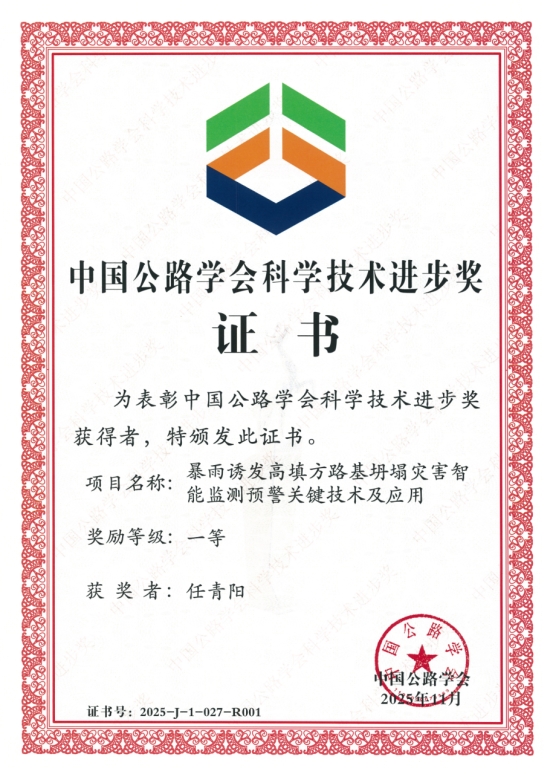 12月2日,2025年度中国公路学会科学技术奖颁奖大会在福建厦门召开。重庆交通大学任青阳教授主持完成的“暴雨诱发高填方路基坍塌灾害智能监测预警关键技术及应用”荣获2025年度中国公路学会科学技术进步一等奖。这一殊荣标志着我国在暴雨诱发高填方路基坍塌灾害智能监测预警及山区公路灾害防治领域取得了具有国际影响力的创新性成果。