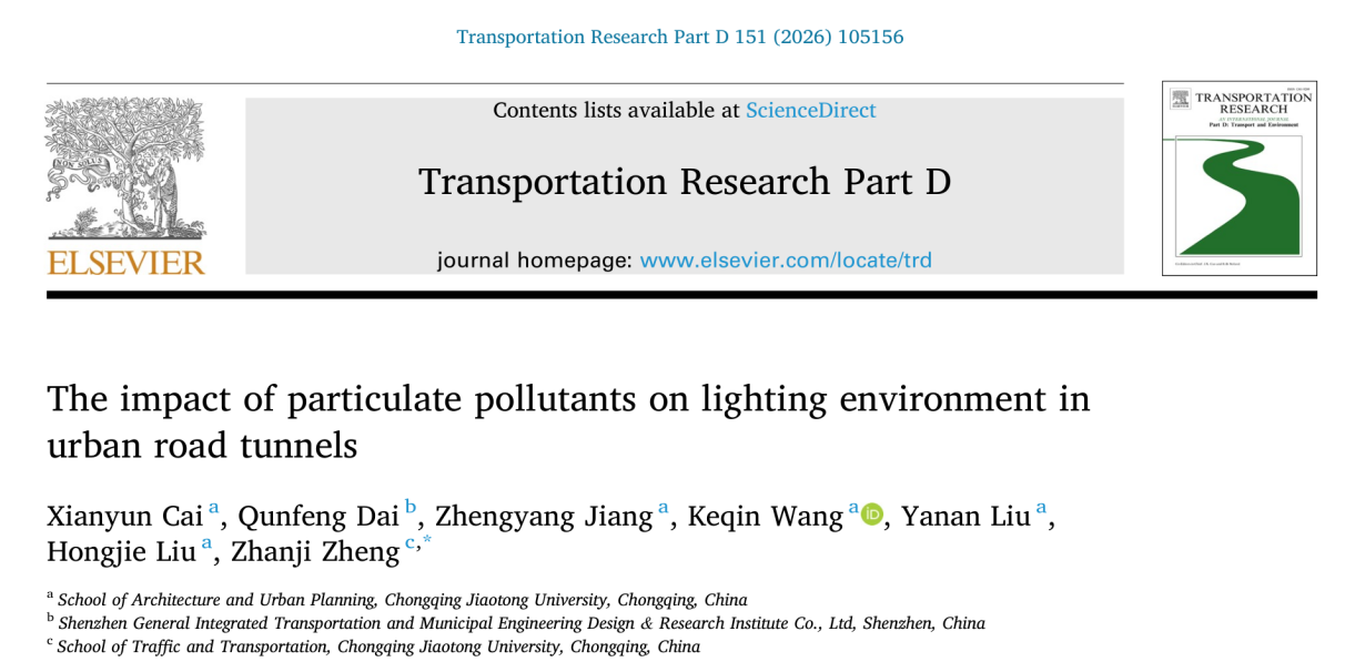 近日,建筑与城市规划学院智慧建筑系蔡贤云副教授以第一作者身份,在交通领域顶刊《Transportation Research Part D: Transport and Environment》(SCI中科院1区Top+SSCI检索,IF=7.7)发表了题为“The impact of particulate pollutants on lighting environment in urban road tunnels”的研究论文(交通运输学院郑展骥副教授为通讯作者)。