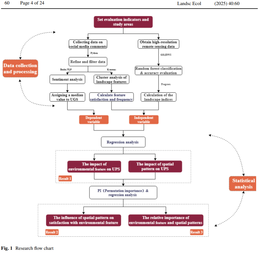 发表于《Landscape Ecology》的研究,突破传统单一维度研究范式,在同一框架内综合评估了环境特征与空间格局对公园整体满意度的影响程度与相对重要性。研究首次明确指出公园的外部形态(空间格局)与内部要素(环境特征)对使用者满意度具有同等重要作用,且存在“最优区间”效应。