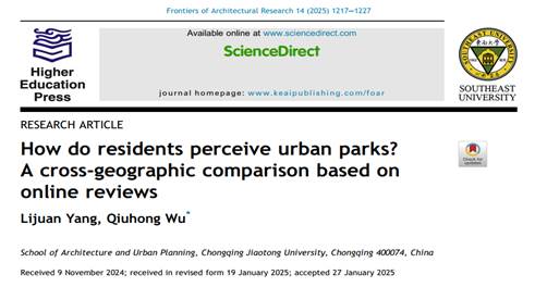 重庆交通大学建筑与城市规划学院杨丽娟副教授团队的最新研究成果“How do residents perceive urban parks? A cross-geographic comparison based on online reviews”发表于期刊《Frontiers of Architectural Research》(A&HCI,Q1区)。成果“Which affects park satisfaction more, environmental features or spatial pattern?”发表于景观生态学领域的旗舰期刊《landscape Ecology》(SCI,Q2区)。