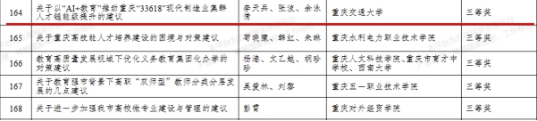 此次获奖的论文聚焦新时代西部大开发、“AI+教育”赋能制造业人才培养、大中小思政课一体化建设、高校科技创新与产业创新融合等关键领域,精准对接国家重大战略与现代化新重庆建设核心需求,兼具前瞻性、创新性与实用性,为相关部门决策提供了高质量智力支撑。