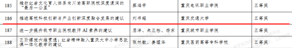 近日,重庆市2025年教育咨政决策论文评选结果揭晓,我校翟东波等人撰写的《重庆市高校服务新时代西部大开发重要战略支点的建议》荣获一等奖;李天兵等人撰写的《关于以“AI+教育”推动重庆“33618”现代制造业集群人才链能级提升的建议》,黄丹、张晓平撰写的《深入推动我市大中小思政课一体化建设的对策建议》,刘书超撰写的《推进高校科技创新与产业创新深度融合发展的建议》与李坤等人撰写的《突出红岩特质实现“三阶贯通”——重庆市大中小学思政课一体化内容体系构建与机制实施的对策建议》荣获三等奖。