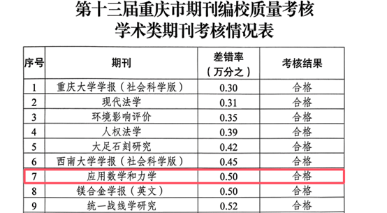 近日,重庆市新闻出版局下发了关于第十三届期刊编校质量考核情况的通报,全市共有140种期刊参加考核,《应用数学和力学》以万分之0.50的差错率名列科技期刊第一、全市第七。
