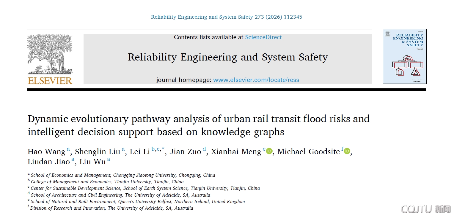 近日,重庆交通大学经济与管理学院王昊副教授与硕士研究生刘圣林合作完成的研究成果“Dynamic evolutionary pathway analysis of urban rail transit flood risks and intelligent decision support based on knowledge graphs”在国际安全与可靠性领域顶级权威期刊《Reliability Engineering & System Safety》(中科院SCI一区TOP,JCR一区,影响因子11,ABS 3星)正式发表。