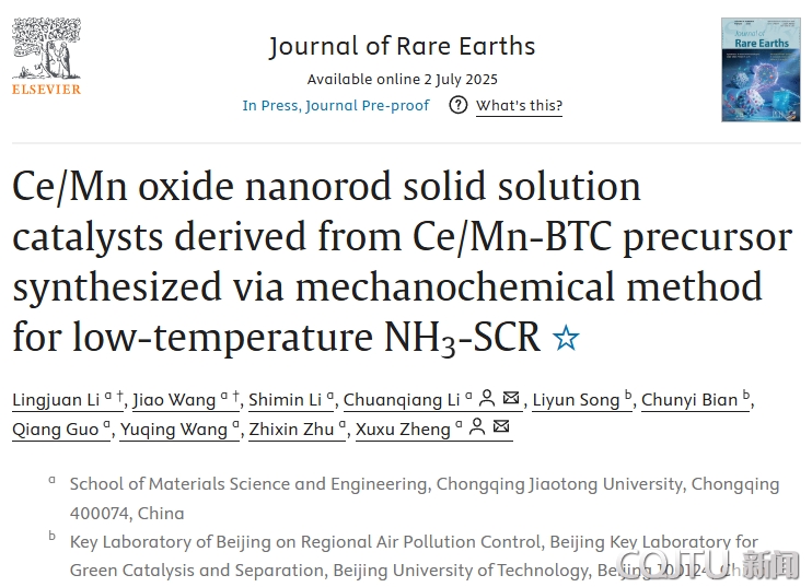 近期,材料科学与工程学院科研团队在国际期刊《Journal of Rare Earths》上发表了题为“Ce/Mn oxide nanorod solid solution catalysts derived from Ce/Mn-BTC precursor synthesized via mechanochemical method for low-temperature NH3-SCR”的科技论文。《Journal of Rare Earths》为材料与化学领域顶级期刊(SCI一区,TOP),影响因子7.2,该期刊由中国稀土学会和有研科技集团有限公司主办,北京大学严纯华院士任主编,是全球唯一一本专门报道稀土基础理论和应用科学研究工作的英文版科技期刊,刊登有创新内容、实验数据较完整且学术水平较高的研究成果及热点研究领域的领先成果的首发论文。该论文的第一作者为材料学院硕士研究生李铃娟和王娇,通讯作者为郑旭煦教授和李传强教授。