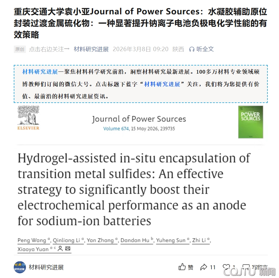 近日,重庆交通大学材料科学与工程学院2023级硕士研究生王鹏(导师:研究生导师团队负责人袁小亚教授)在期刊《Journal of Power Sources》(电化学领域SCI二区,影响因子7.9)上发表题为“Hydrogel-assisted in-situ encapsulation of transition metal sulfides: An effective strategy to significantly boost their electrochemical performance as an anode for sodium-ion batteries”的研究论文,并被《材料研究进展》公众号摘录翻译成中文推荐介绍。