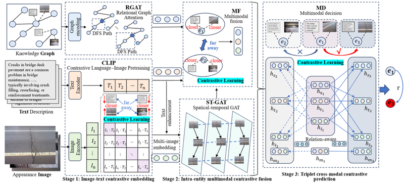 该论文创新性地将多模态数据驱动的桥梁缺陷诊断与养护决策归结为领域知识图谱链接预测问题,并提出一种联合时空特征融合与跨模态对比交互的多模态链接预测方法。首先,论文构建了一个面向桥梁管养领域的多模态知识图谱BM3KG。然后,论文提出了结合深度优先搜索DFS与关系图注意力网络RGAT的多模态信息编码策略。其次,论文提出的模型通过对比语言-图像预训练模型CLIP实现跨模态联合嵌入,融合图像与文本中的时空语义信息,并引入虚拟嵌入机制以处理个别图像模态缺失问题。论文还采用时空图注意力网络ST-GAT对文本描述和图像所蕴含的时间与空间特征进行联合建模。通过渐进式跨模态对比交互策略,模型在保持模态内特征表达能力的同时增强模态间语义对齐,从而提升实体-关系链接预测性能。研究结果表明,论文提出方法在桥梁养护决策多模态链接预测任务中表现出显著的性能优势,能够为桥梁缺陷诊断与养护决策提供细粒度的多模态知识推理支持。