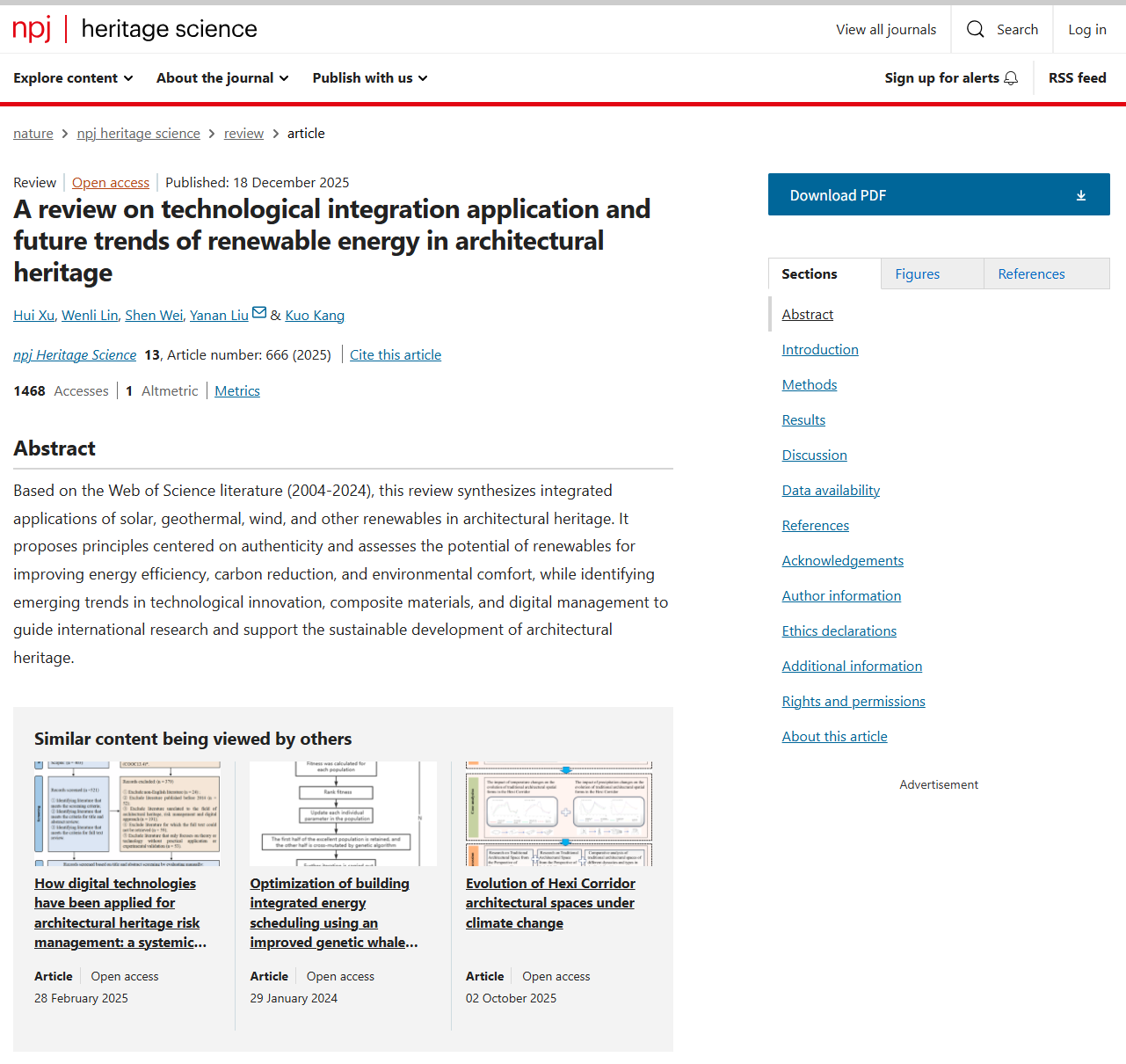 近日,重庆交通大学建筑与城市规划学院交通历史与遗产方向徐辉副教授团队的最新研究成果“A review on technological integration application and future trends of renewable energy in architectural heritage”发表于SCI(Q1区)期刊《npj Heritage Science》(中国科学院1区Top期刊),本次研究工作由徐辉、林文利、刘亚南、魏绅、康阔等团队成员协作完成。《npj Heritage Science》为Nature Portfolio旗下的npj(Nature Partner Journals)合作体系,是nature唯一的文化遗产方向合作期刊。根据科睿唯安(Clarivate Analytics)2024-2025年度期刊引证报告(JC0052),该刊的影响因子IF和期刊引文指标JCI两项评价指标均位列人文科学、材料科学、跨学科研究等领域Q1区,在2023-2025年发布的中国科学院期刊分区表中,大类学科位于艺术学一区,小类学科亦位于人文科学和文化遗产保护与科学领域一区,目前已被科学引文索引扩展版(SCIE)和艺术与人文引文索引(A&HCI)双索引收录,同时也被Scopus、DOAJ等国际数据库收录。